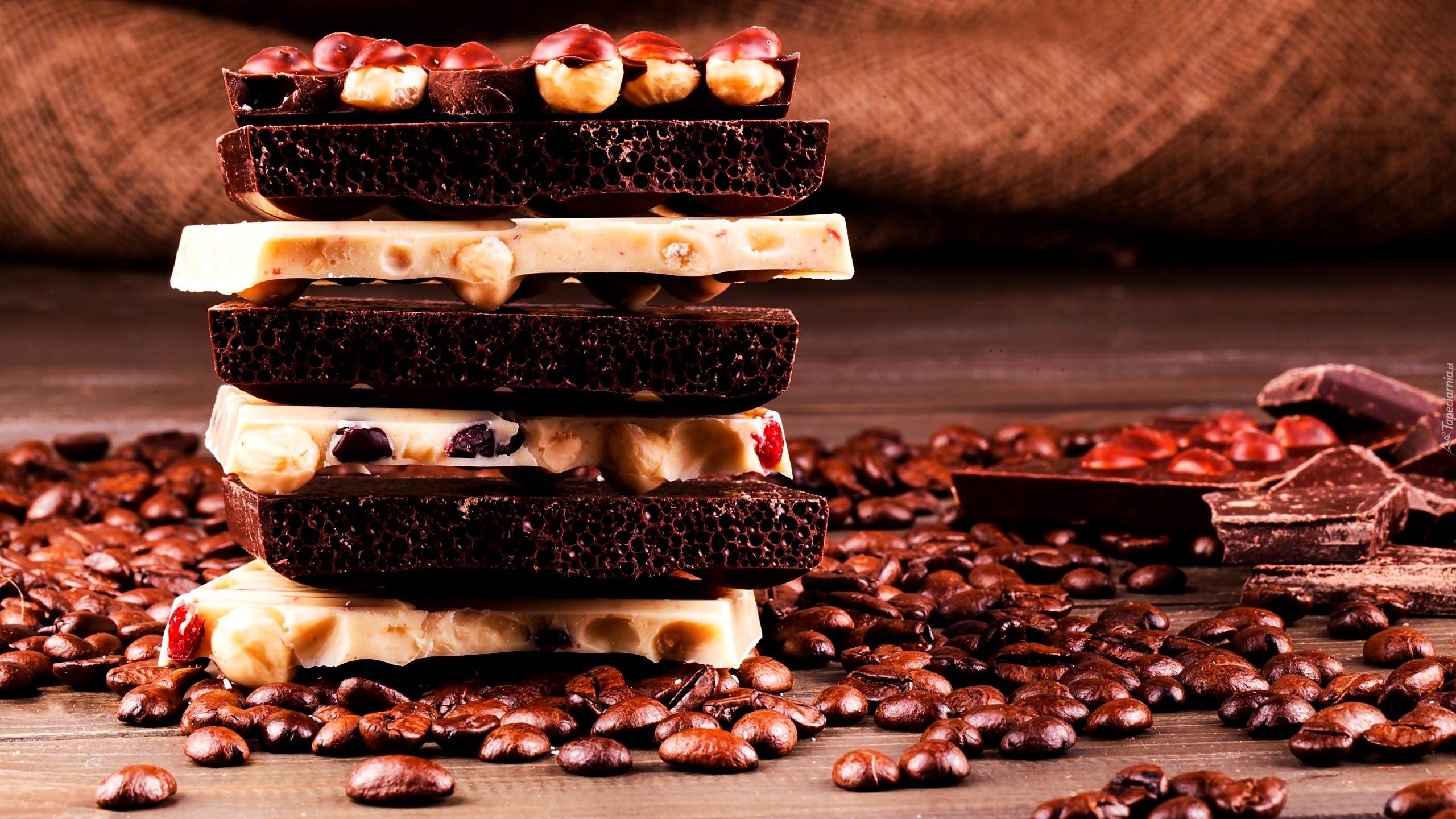 Edytor tapety: Czekolada ciemna i biała na ziarnach kawy