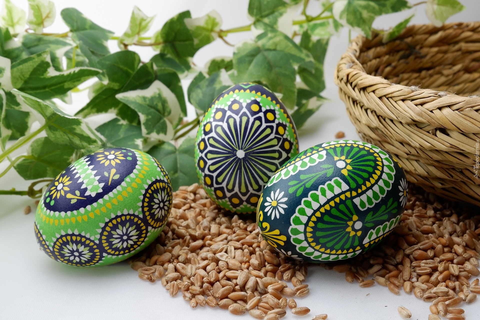 Edytor tapety: Kolorowe pisanki obok koszyka