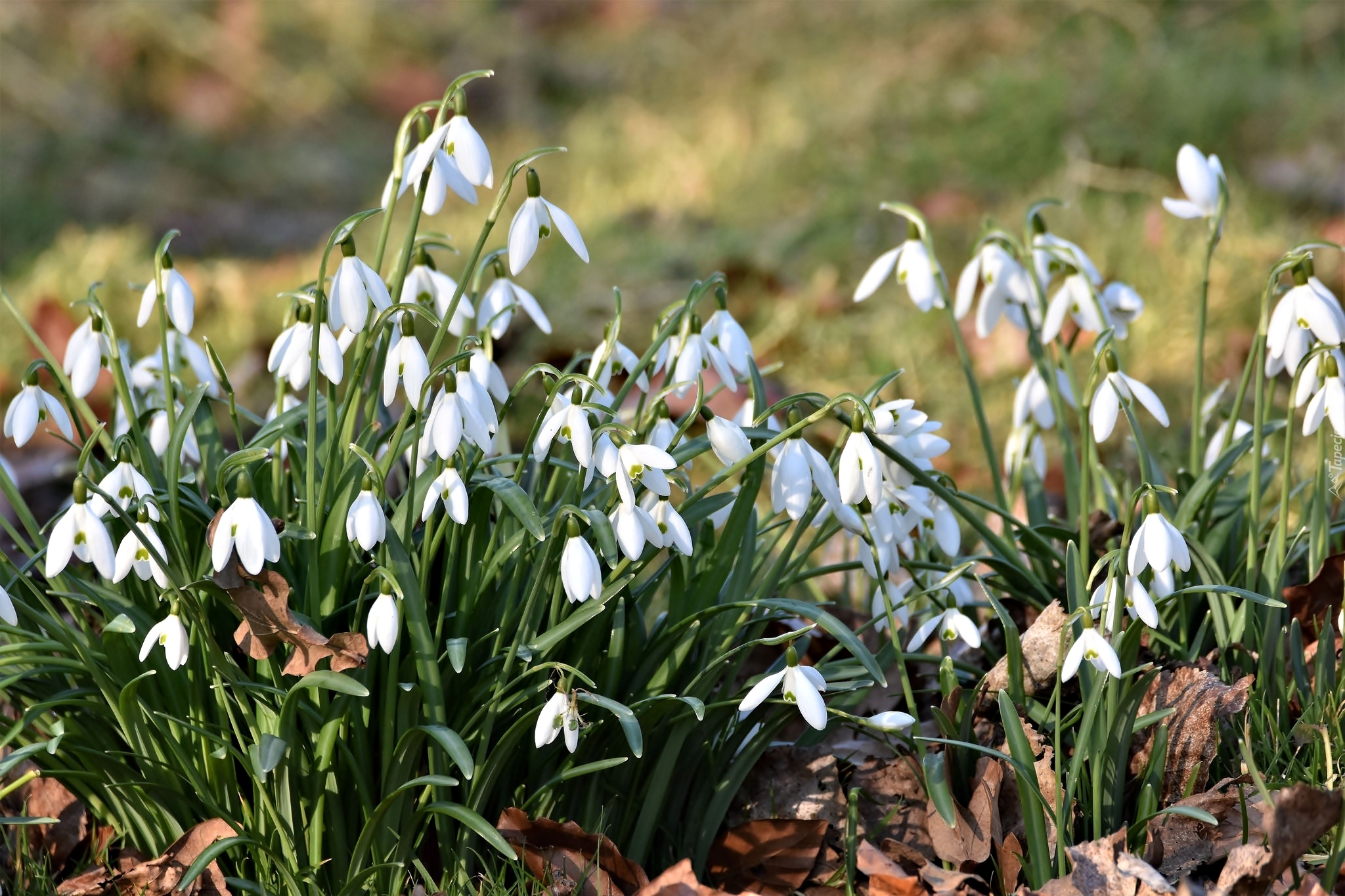 Edytor tapety: Liście zaplątane w kępkach przebiśniegów