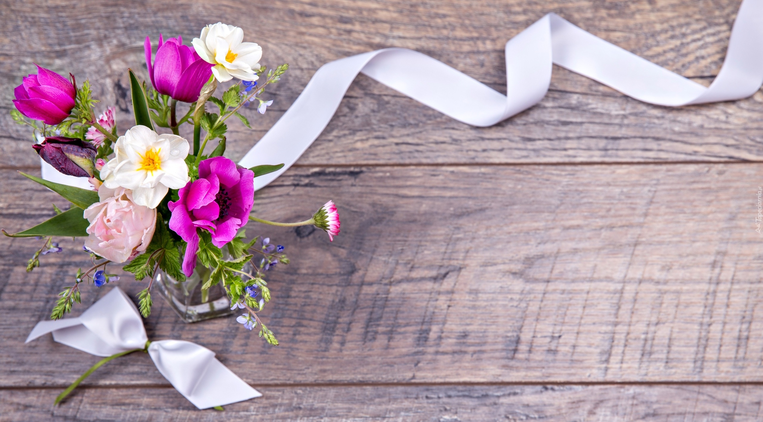 Edytor tapety: Wstążka obok wazonika z kwiatkami na deskach