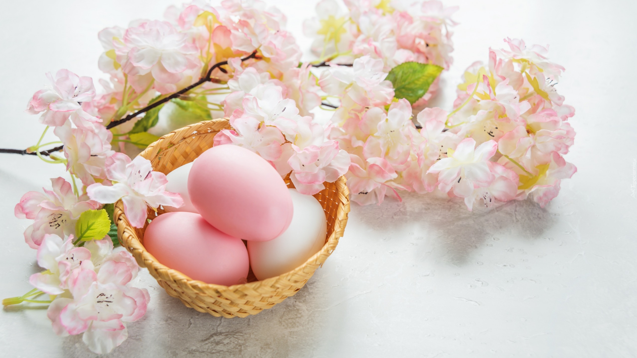 Edytor tapety: Pisanki w koszyku obok gałązek