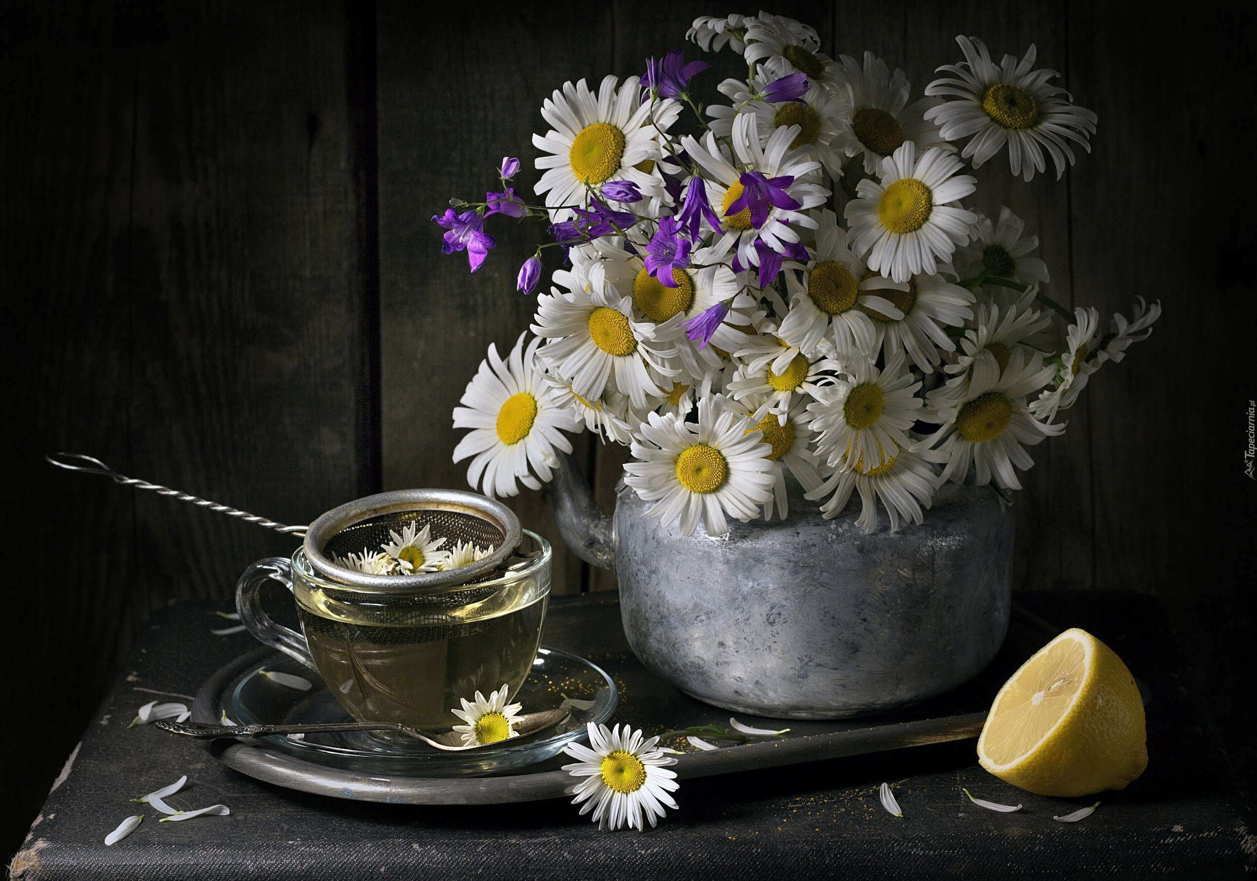 Edytor tapety: Bukiet margerytek obok filiżanki herbaty rumiankowej