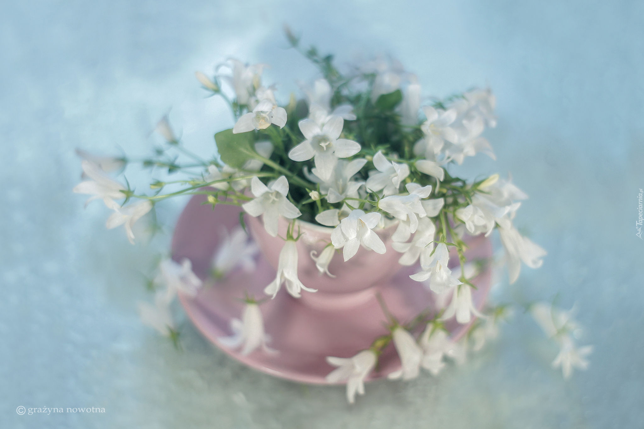 Edytor tapety: Białe dzwonki dalmatyńskie w filiżance