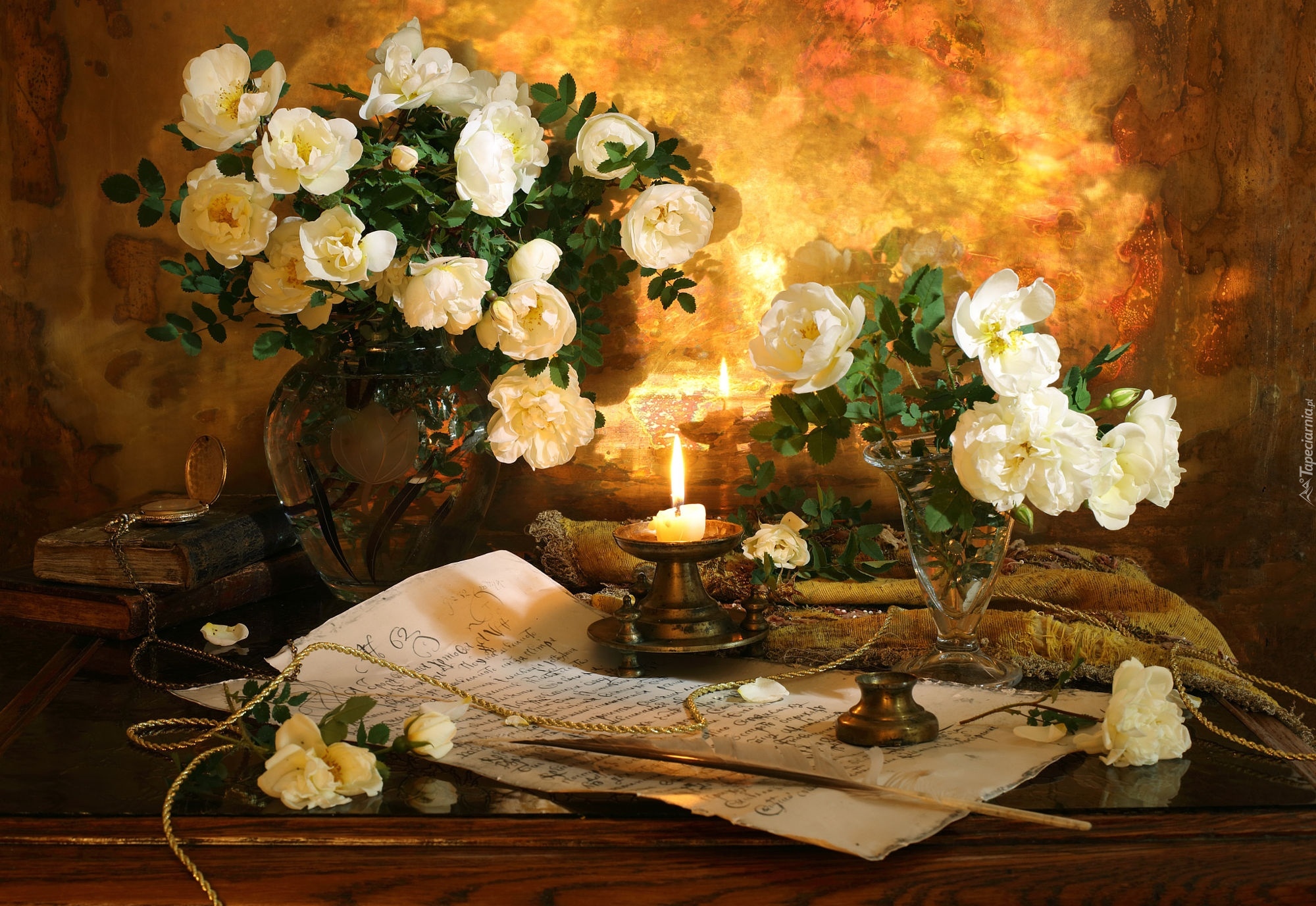 Edytor tapety: Świecznik na rękopisie obok wazonu z kwiatami