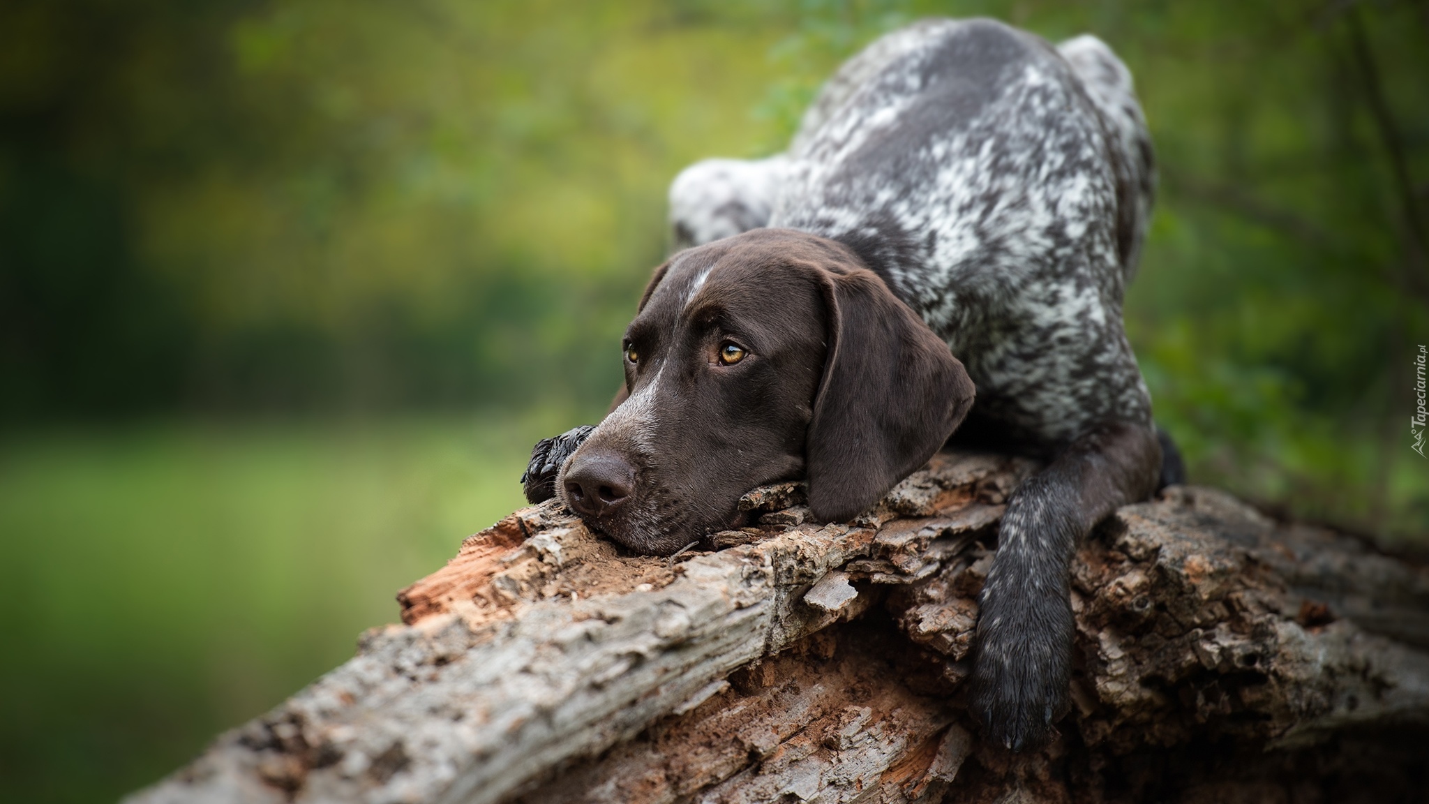 Edytor tapety: Wyżeł niemiecki leżący na konarze