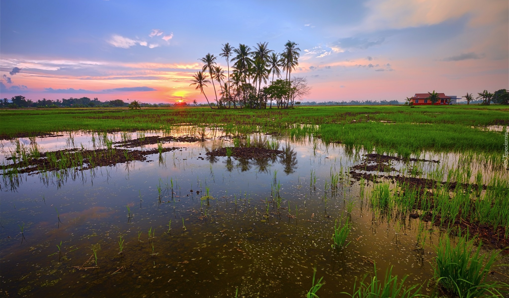 Edytor tapety: Palmy nad rozlewiskiem o zachodzie słońca