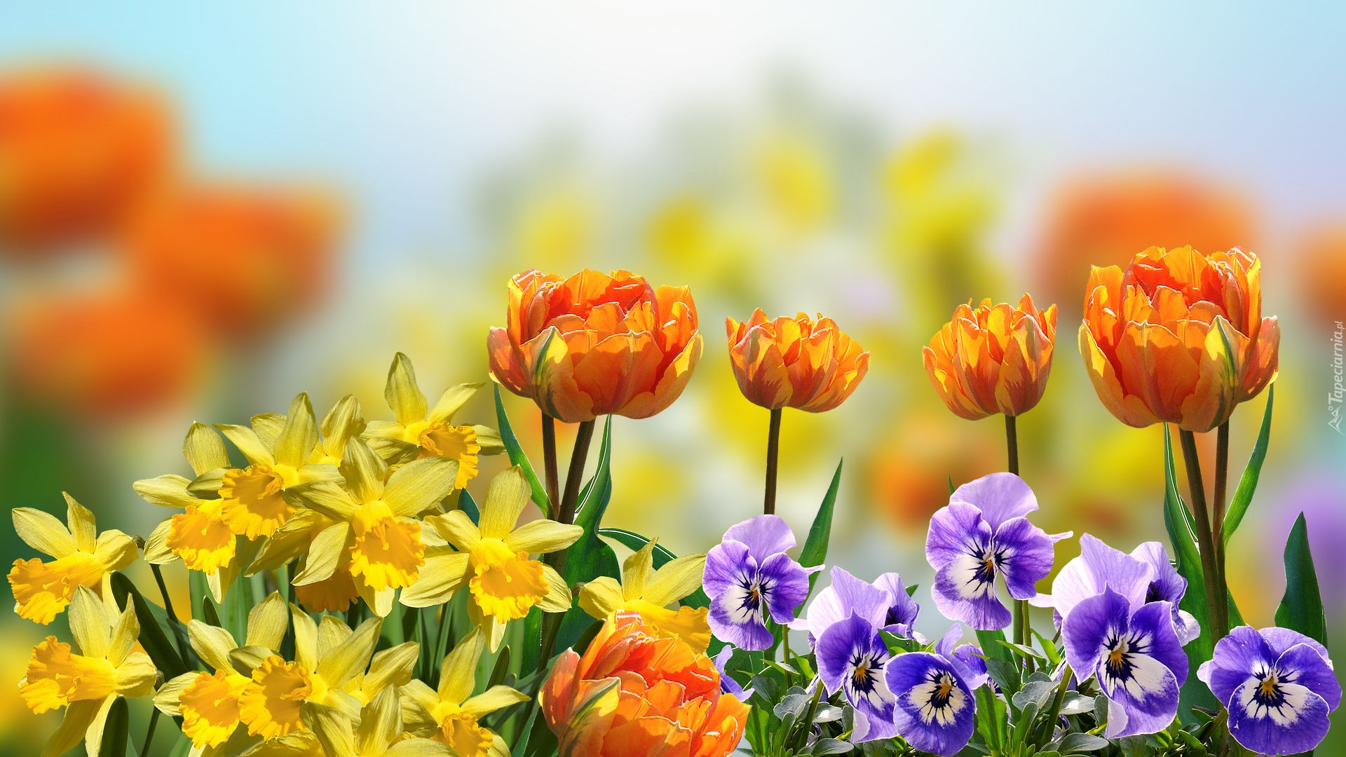 Edytor tapety: Żonkile tulipany i bratki w słońcu