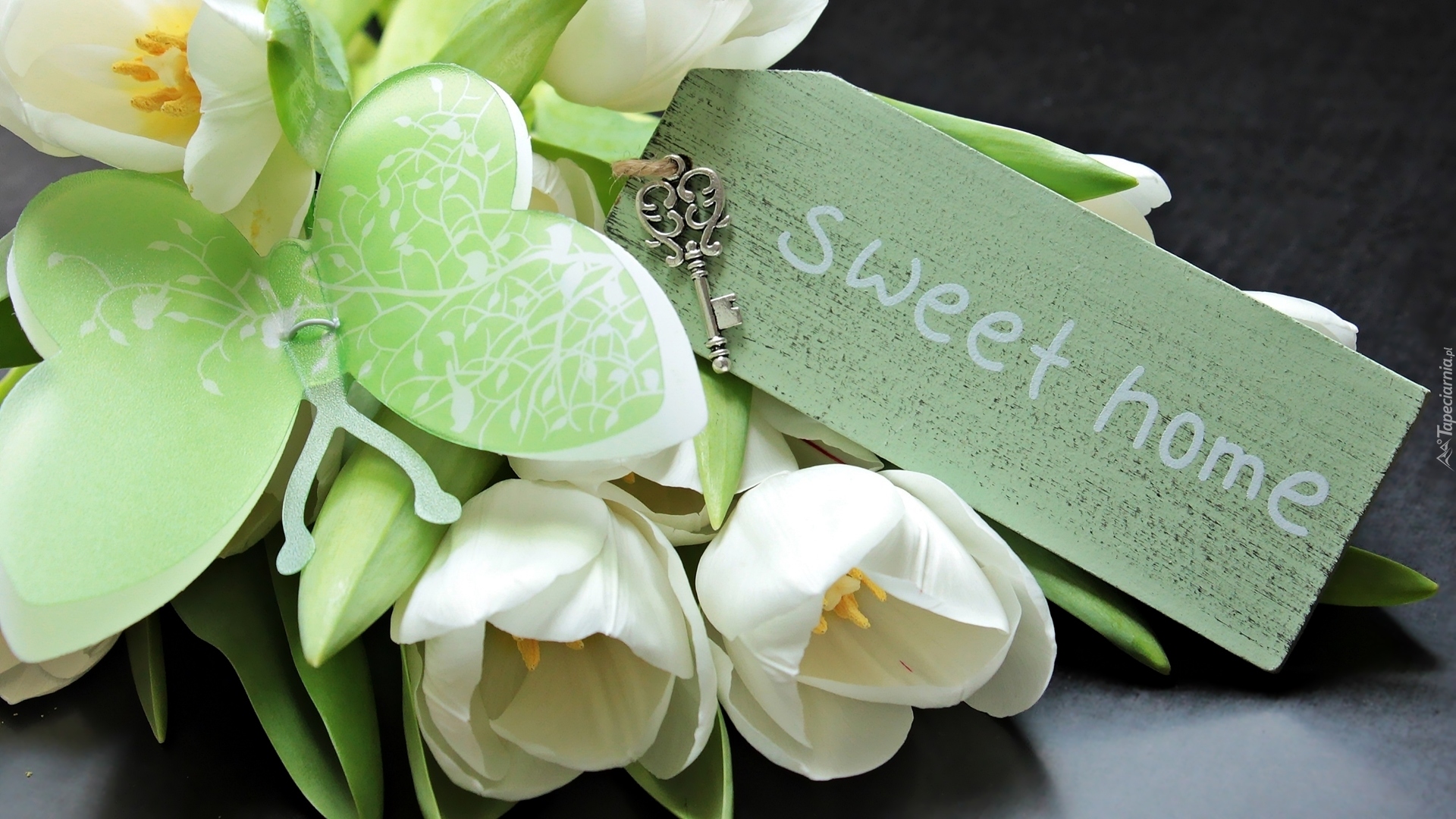 Edytor tapety: Napis Sweet home z motylem kluczykami i kwiatami