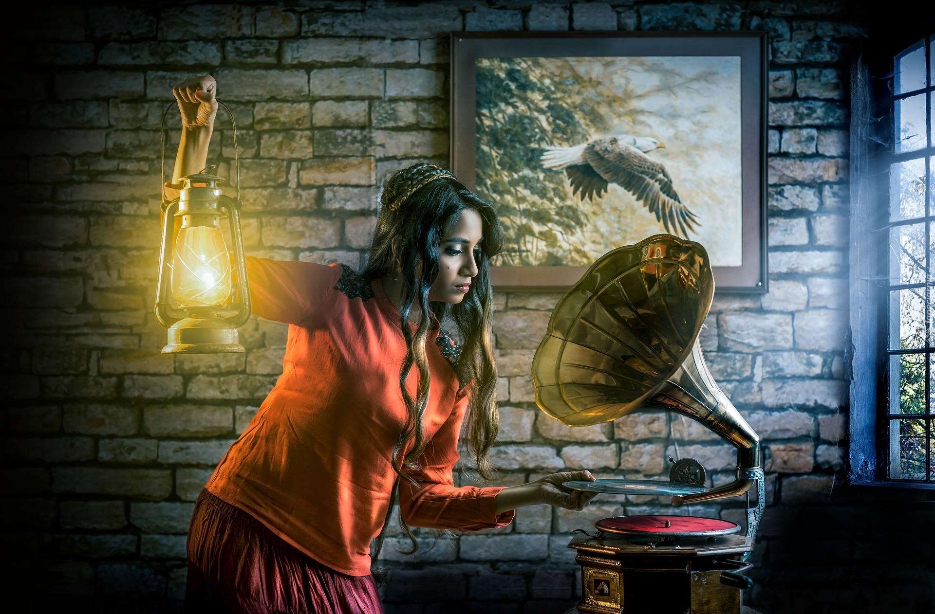 Edytor tapety: Kobieta z lampą naftową przy patefonie