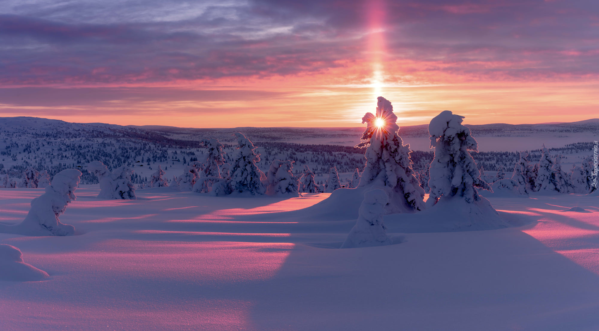 Edytor tapety: Promienie słońca nad ośnieżonymi drzewami