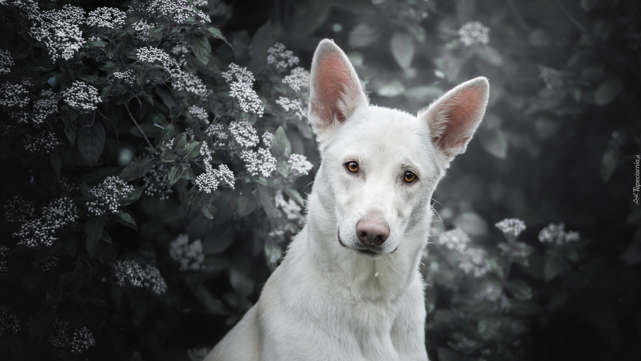 Edytor tapety: Biały owczarek szwajcarski przy roślinach