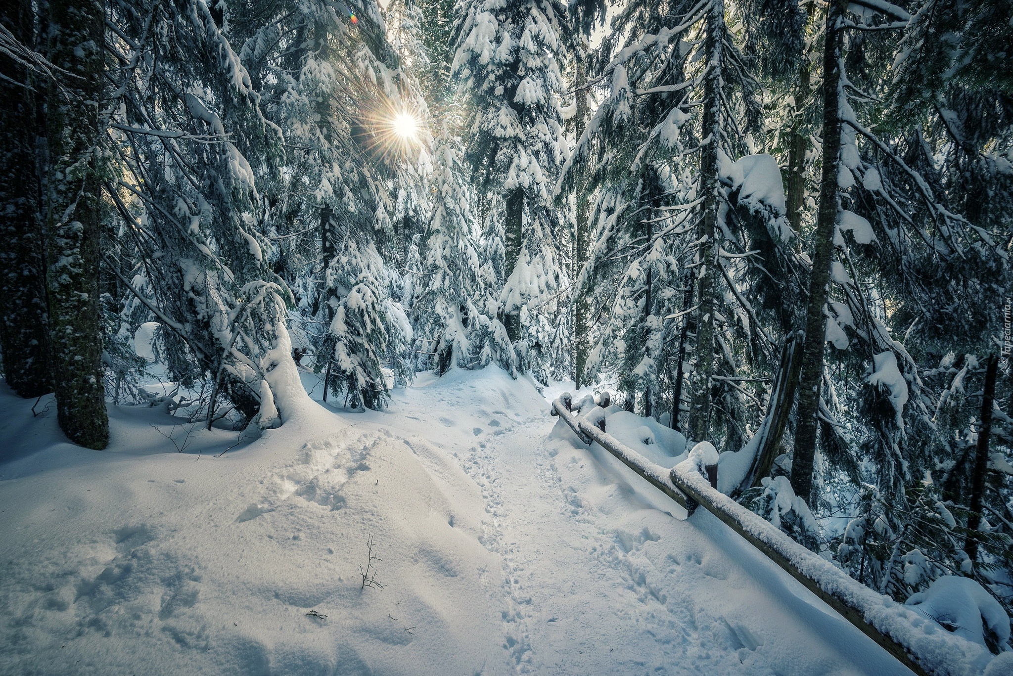 Edytor tapety: Promienie słońca w zaśnieżonym lesie