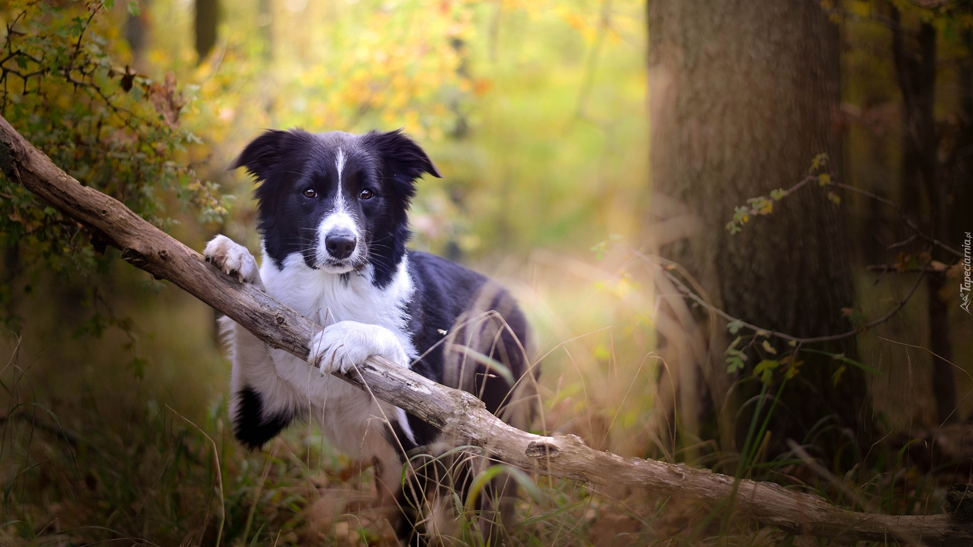 Edytor tapety: Border collie oparty łapkami o gałąź