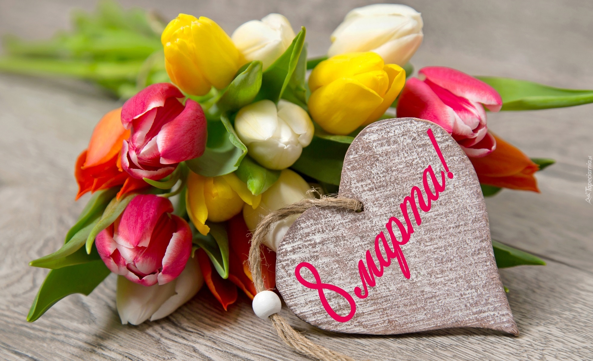 Edytor tapety: Tulipany w kompozycji z sercem na Dzień Kobiet