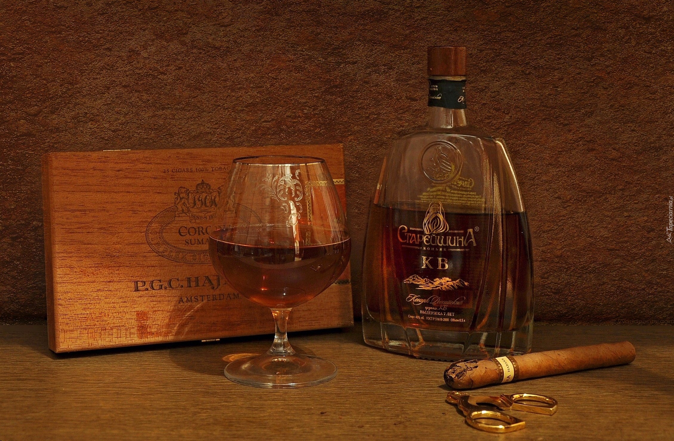 Edytor tapety: Cygaro obok kieliszka i butelki z koniakiem