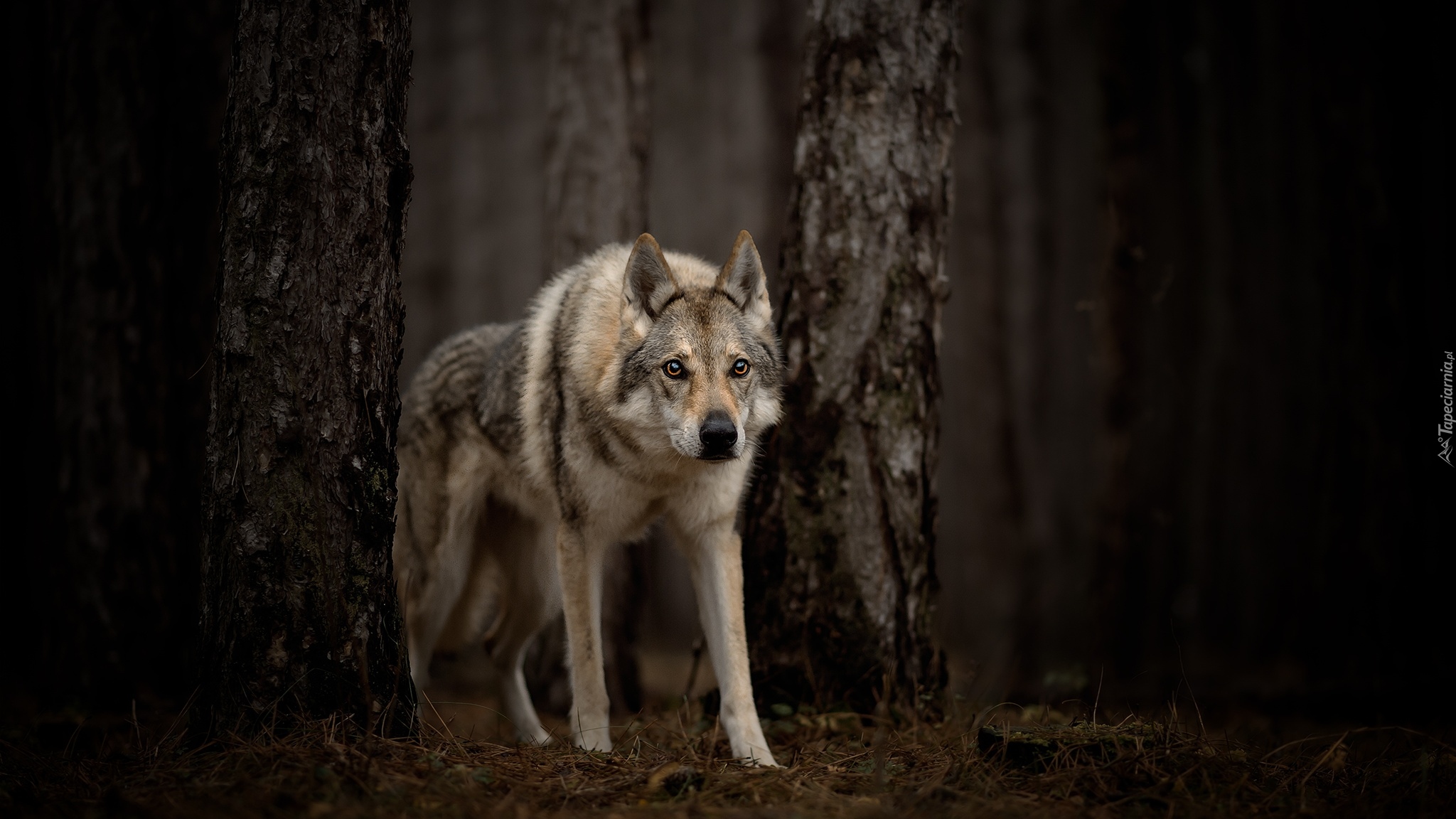 Edytor tapety: Wilczak czechosłowacki w ciemnym lesie