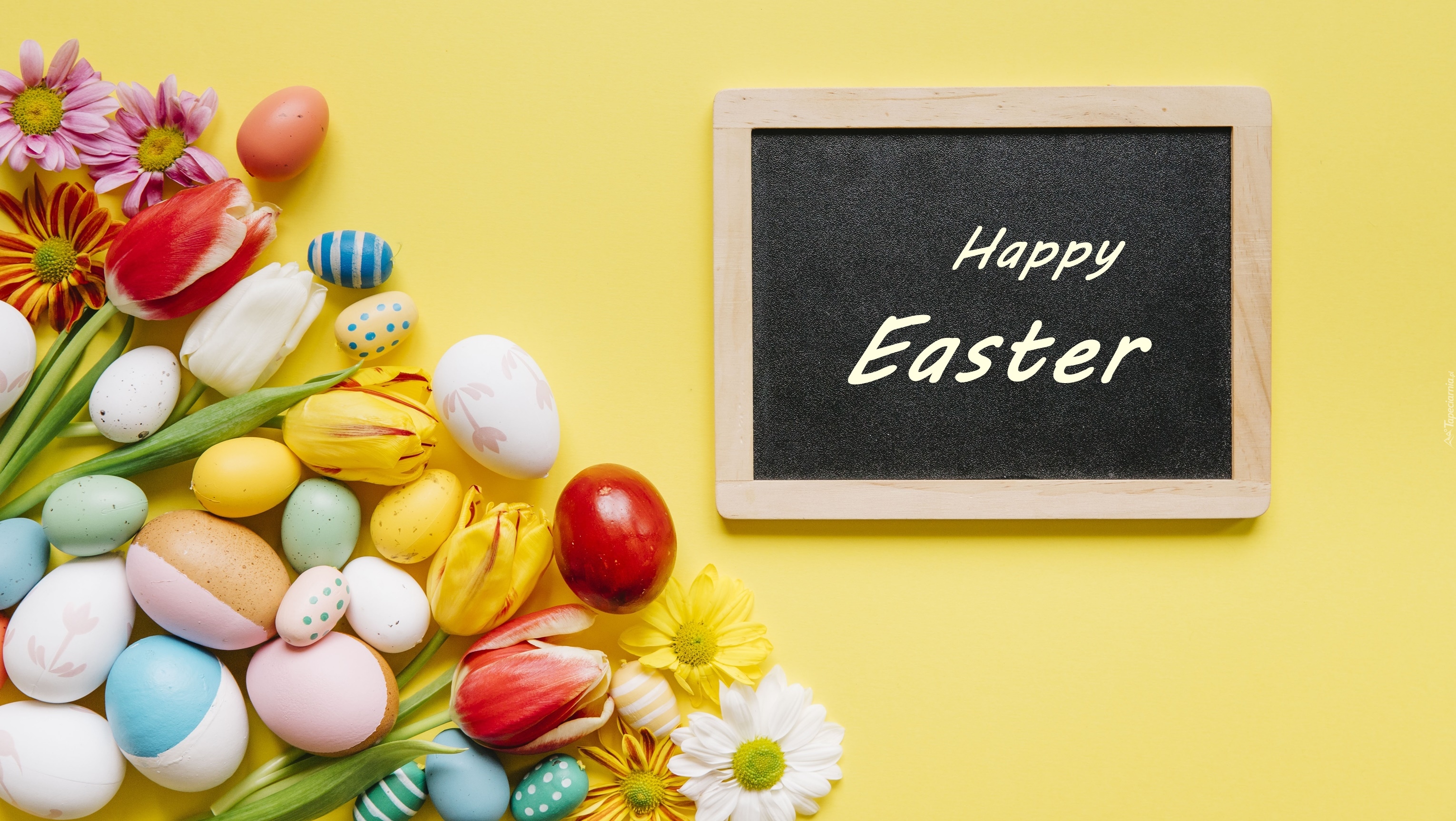 Edytor tapety: Życzenia wielkanocne z pisankami i kwiatami