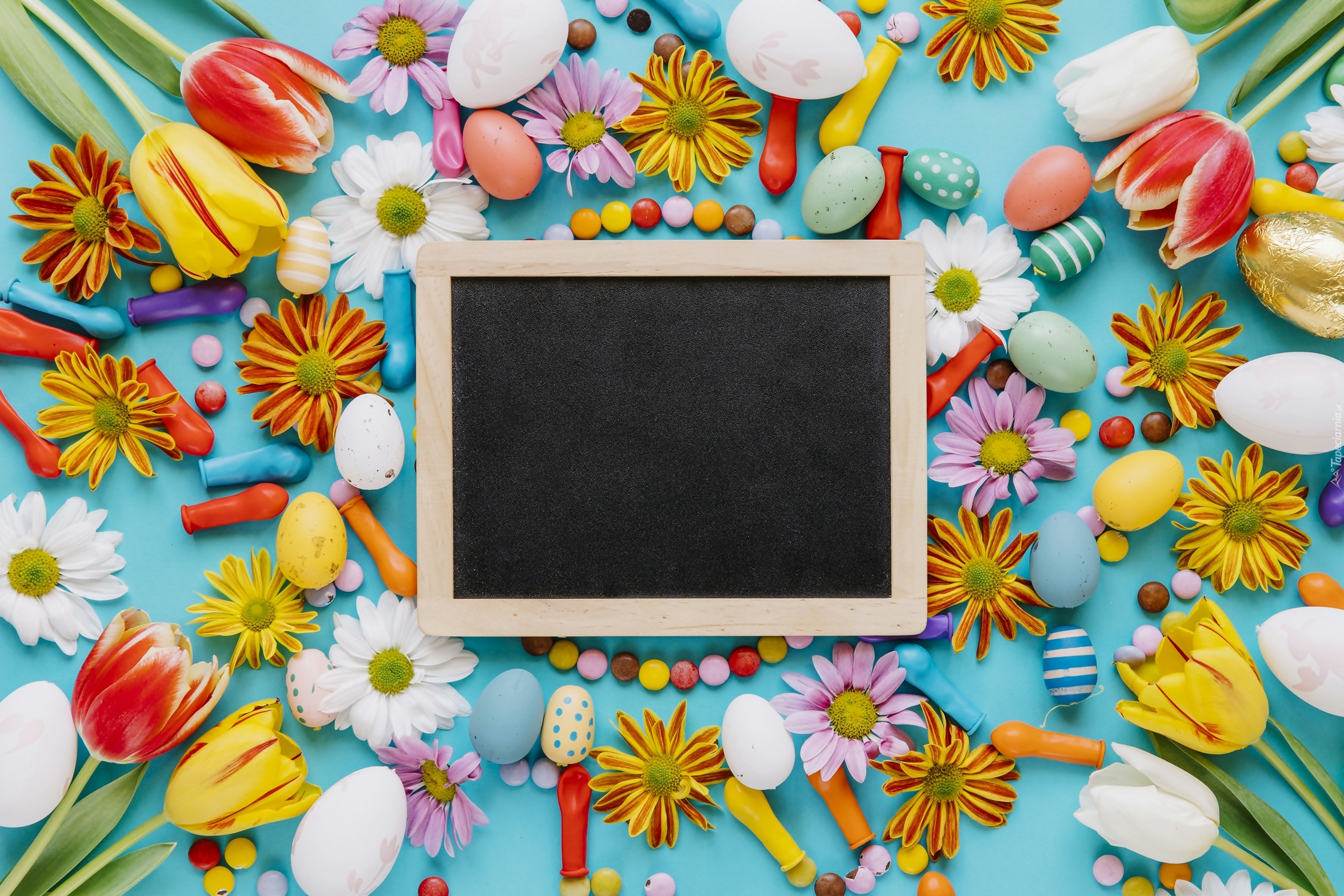 Edytor tapety: Tabliczka pośród pisanek i tulipanów