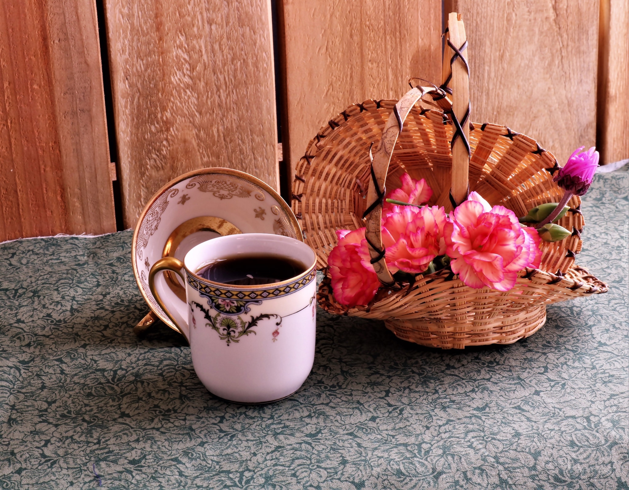Edytor tapety: Kubek kawy obok goździków w koszyku