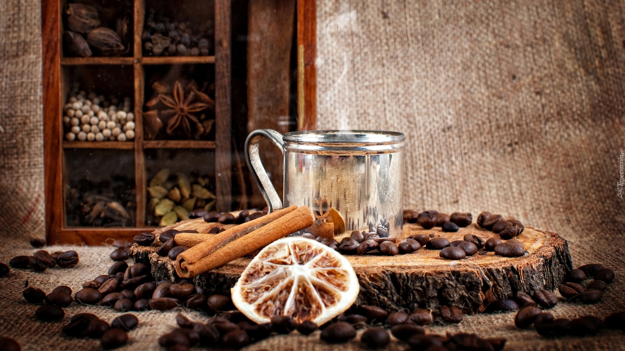 Edytor tapety: Kubek wśród rozsypanych ziaren kawy