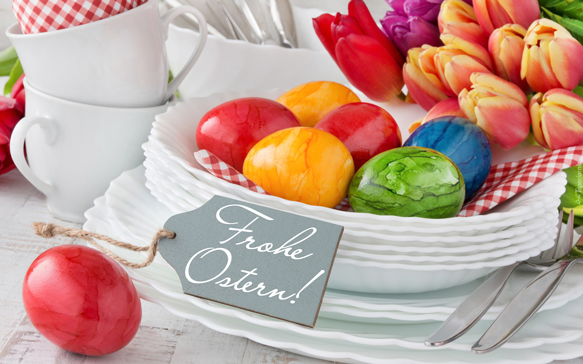 Edytor tapety: Kolorowe pisanki na talerzu z życzeniami