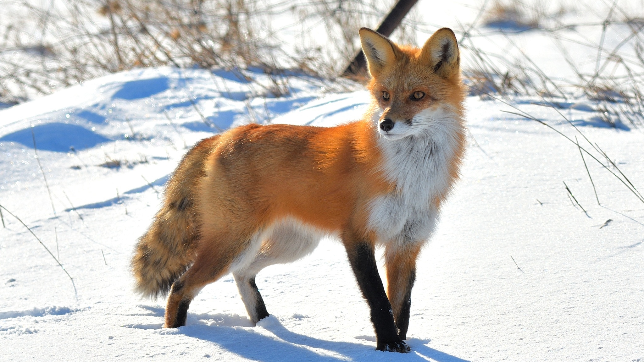Edytor tapety: Obserwujący lis na śniegu