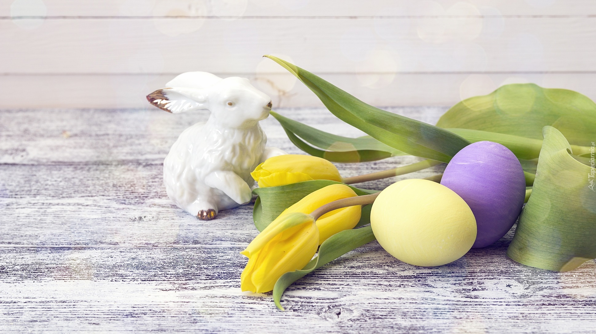 Edytor tapety: Figurka zająca z pisankami i tulipanami