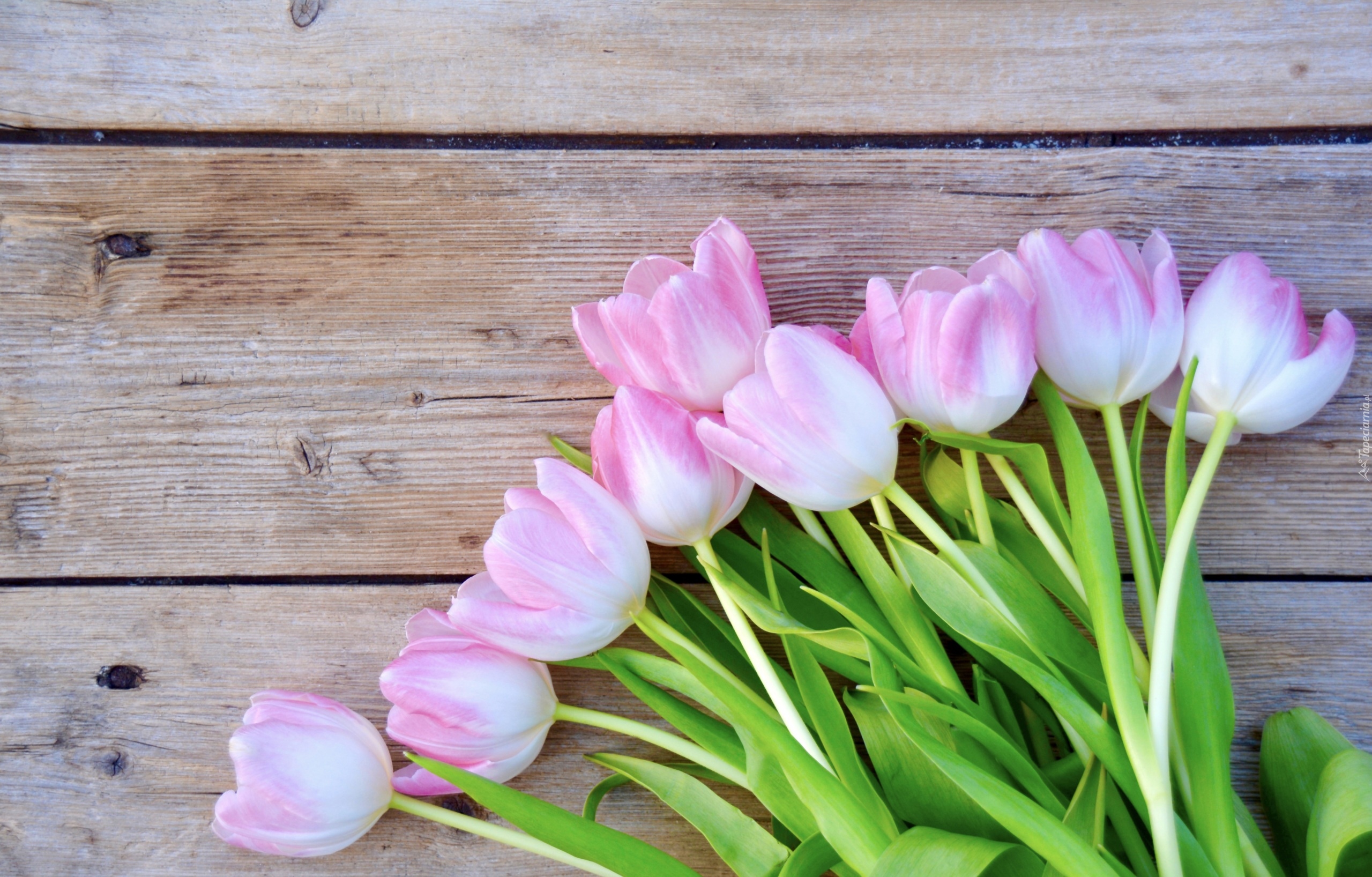 Edytor tapety: Jasnoróżowe tulipany na deskach