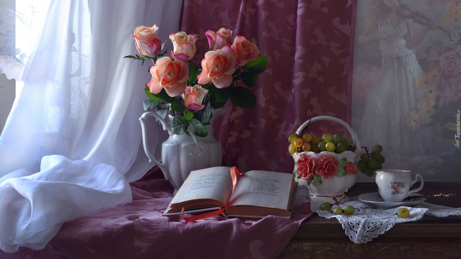 Edytor tapety: Kompozycja z różami w dzbanku i otwartą książką