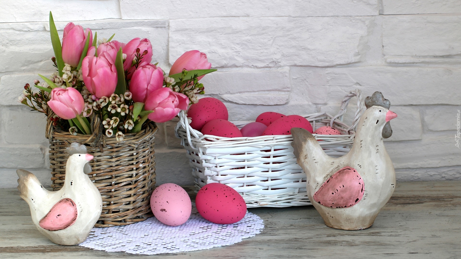 Edytor tapety: Koszyki z tulipanami i pisankami obok kurek