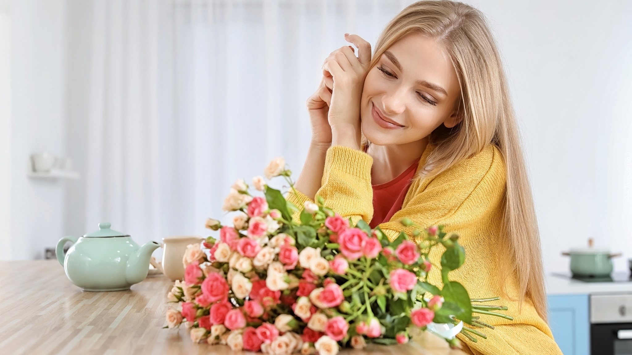 Edytor tapety: Uśmiechnięta kobieta z kwiatami
