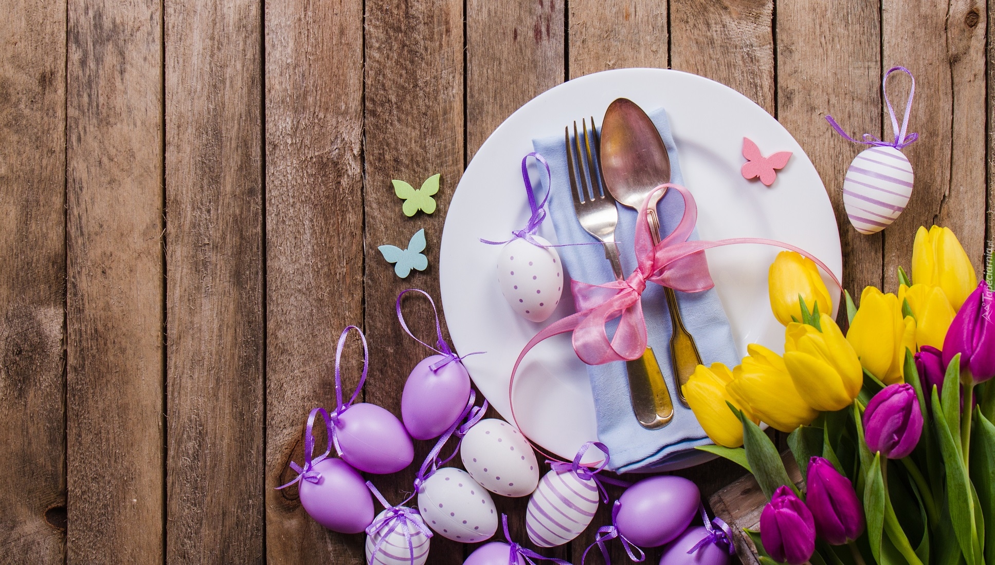 Edytor tapety: Pisanki i tulipany obok talerza ze sztućcami
