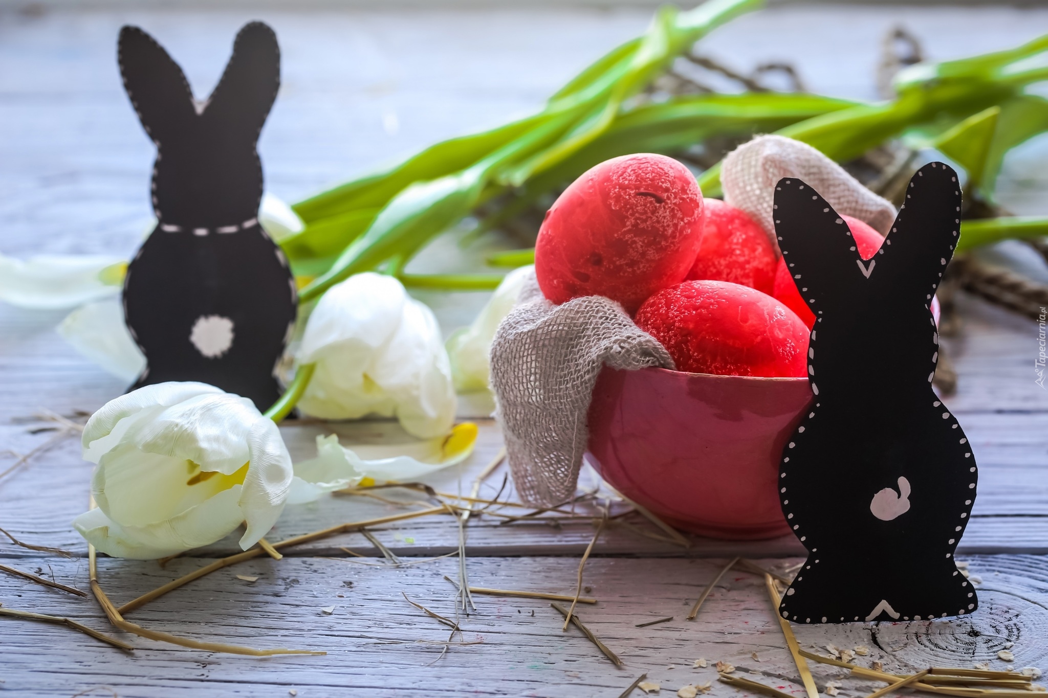 Edytor tapety: Zajączki z pisankami i tulipanami