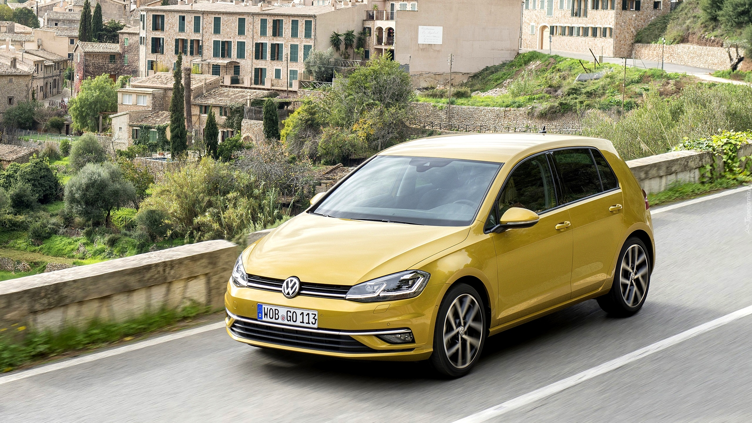 Edytor tapety: Żółty Volkswagen Golf 7 Facelift na drodze