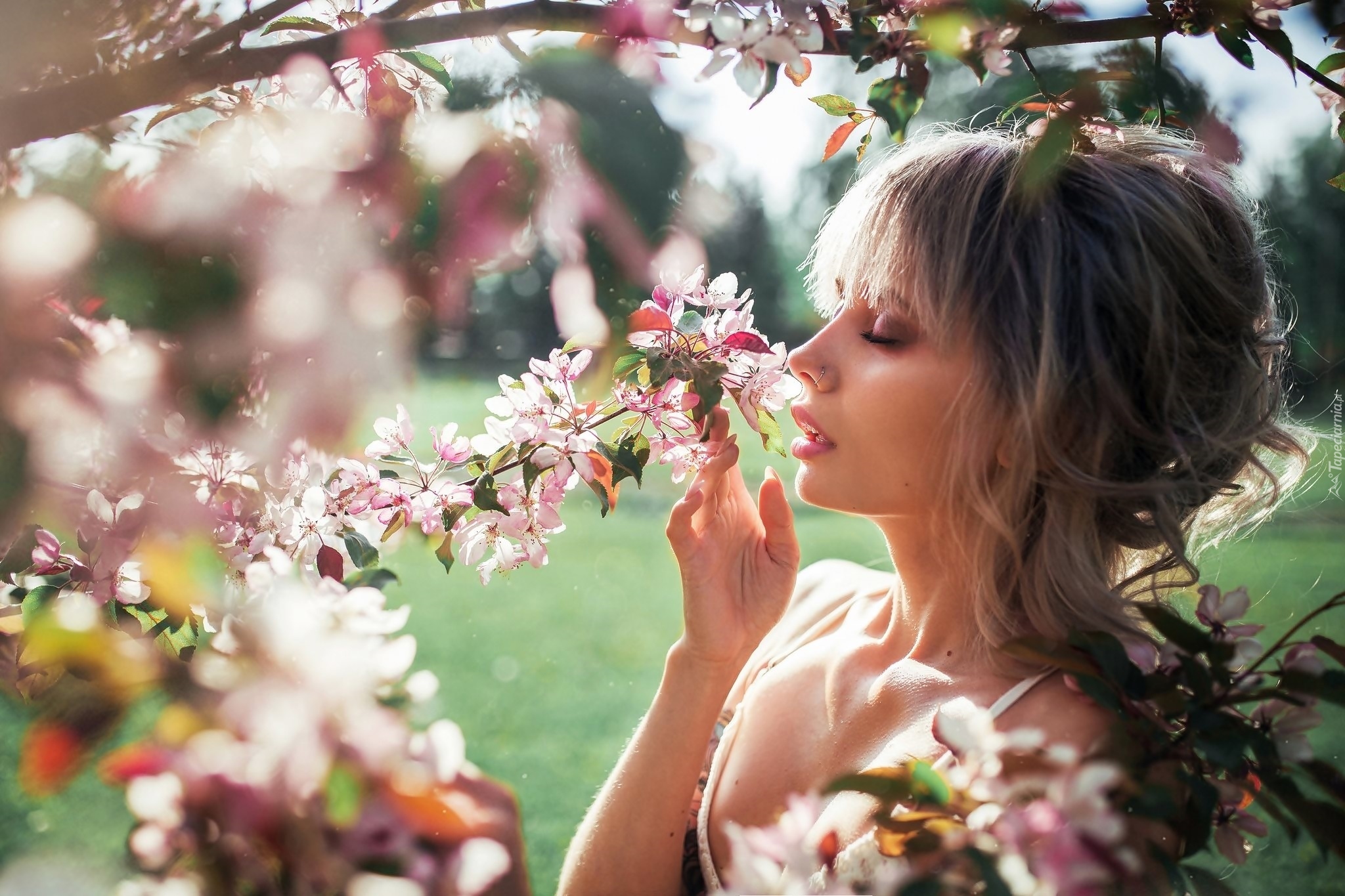 Edytor tapety: Kobieta obok kwitnących gałązek