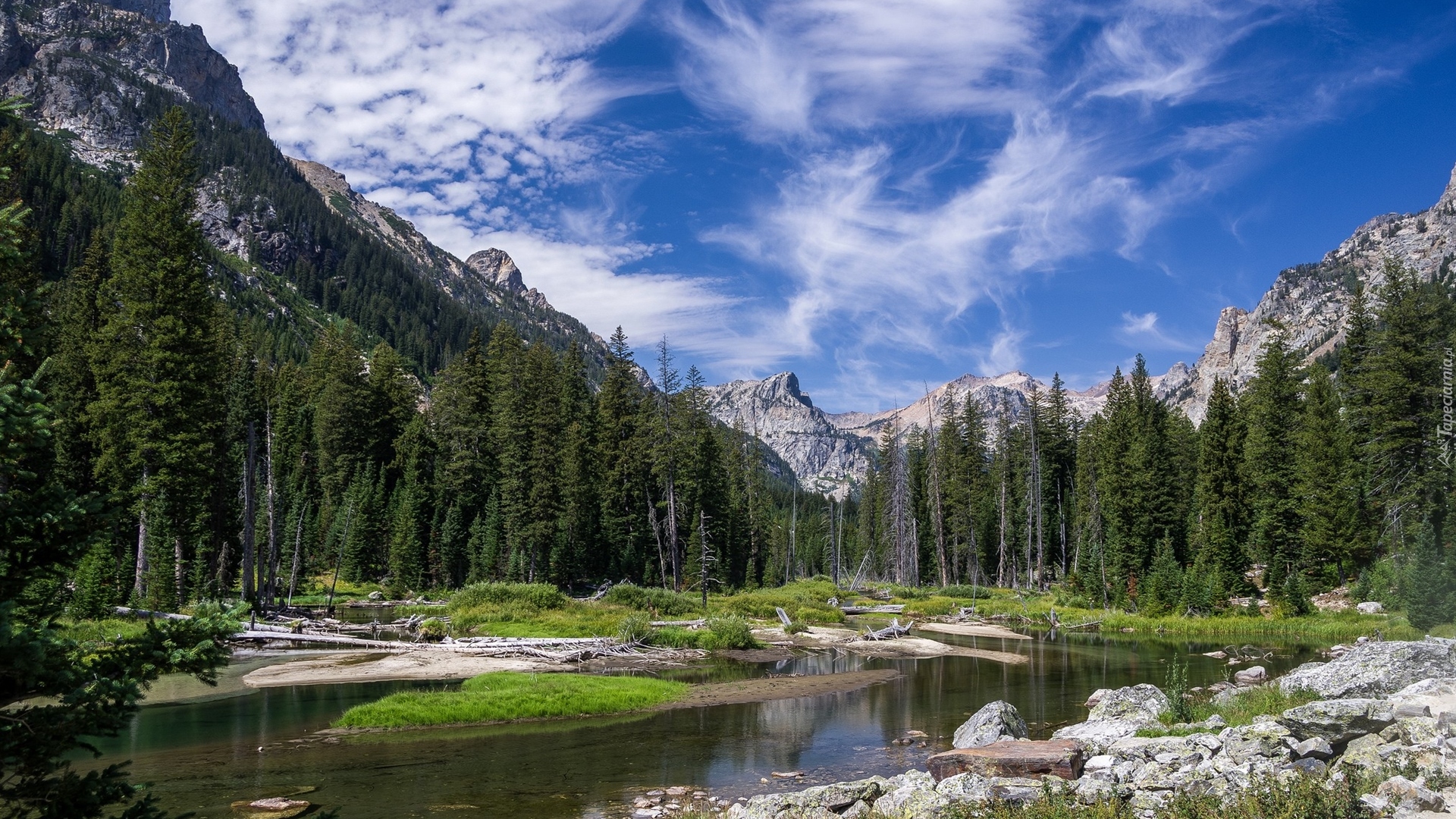 Edytor tapety: Rzeka płynąca obok lasu w górach
