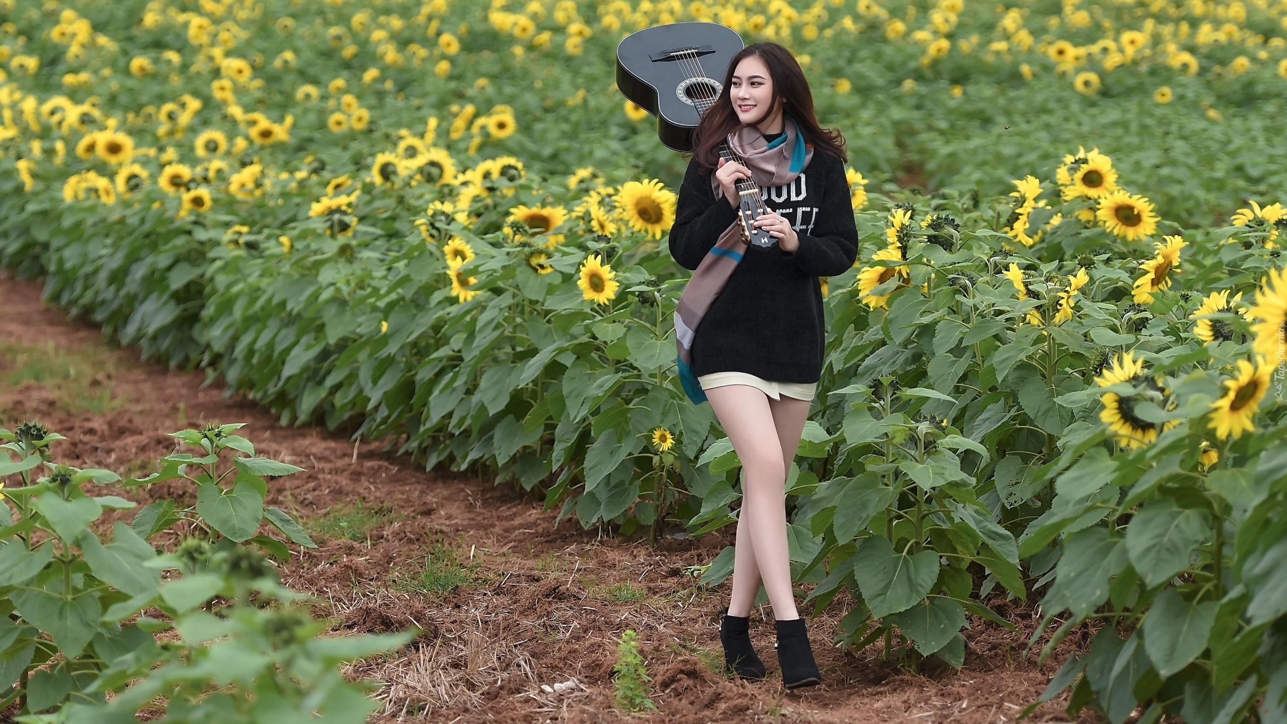 Edytor tapety: Dziewczyna z gitarą na polu słonecznikowym