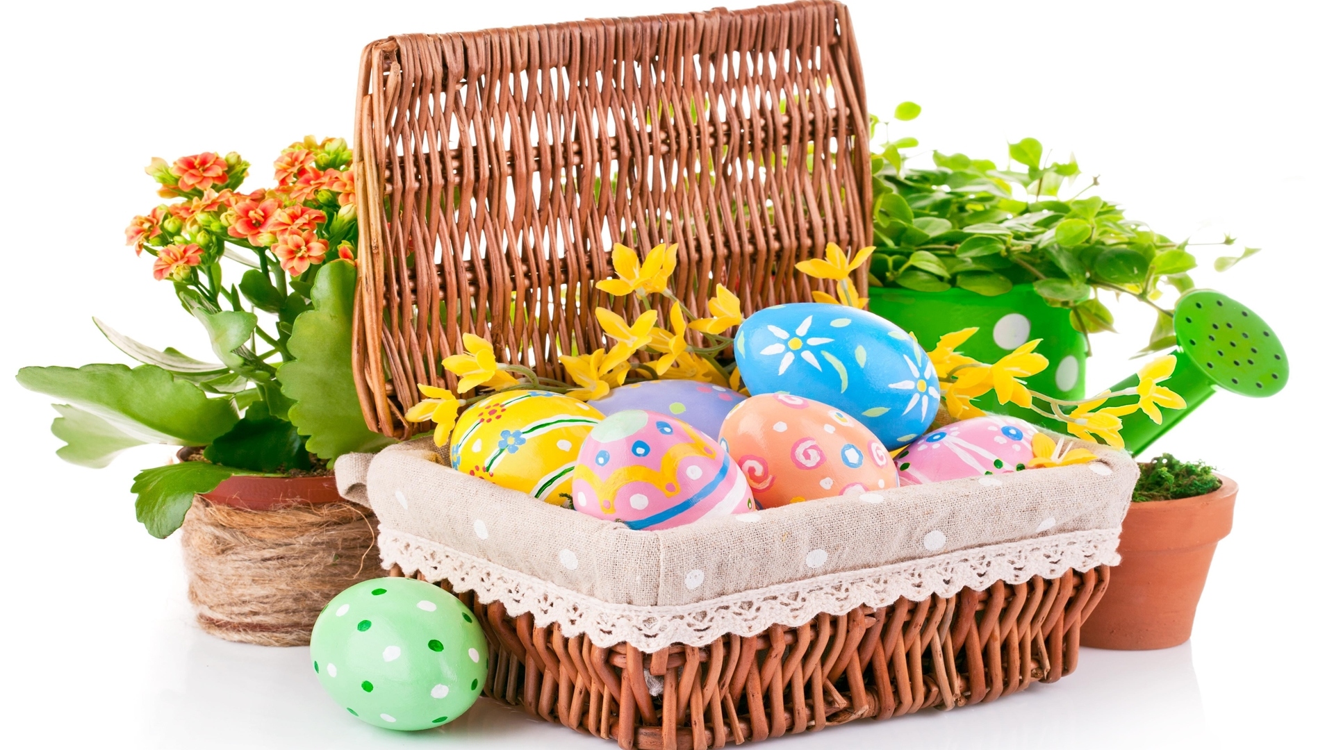 Edytor tapety: Wielkanocne pisanki w koszyku z kwiatkami