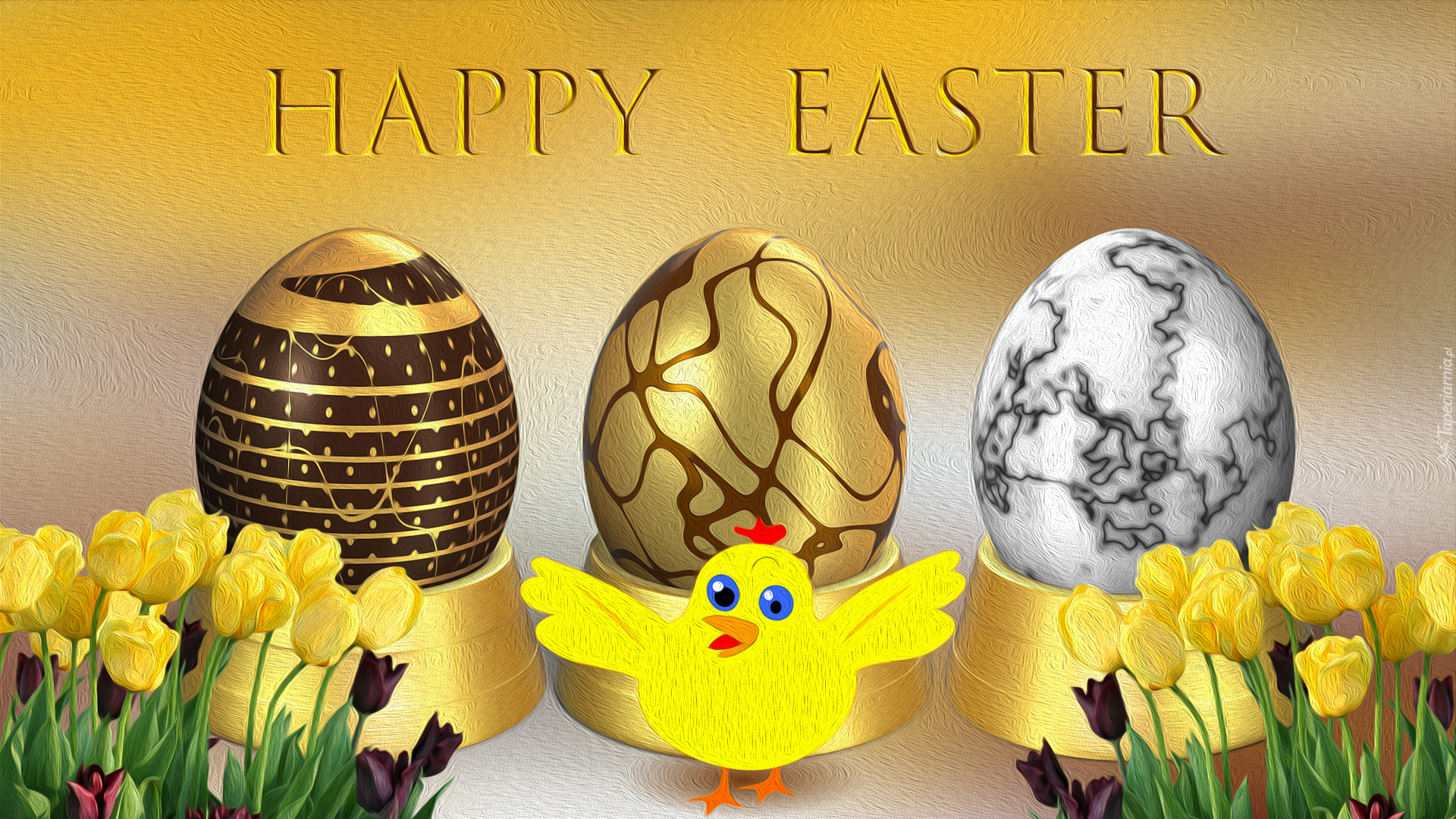 Edytor tapety: Wielkanocna grafika z tulipanami i kurczaczkiem