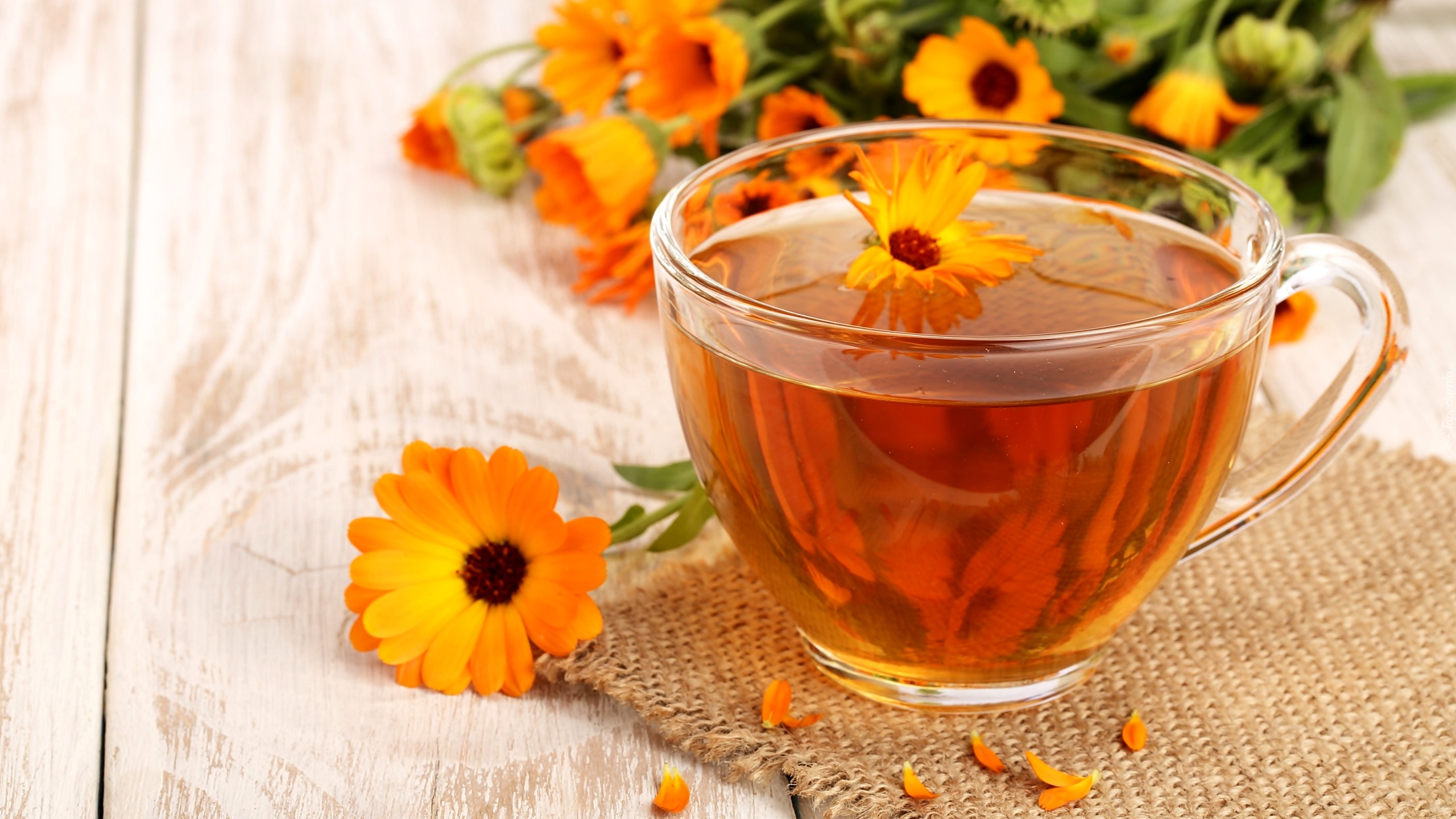Edytor tapety: Filiżanka herbaty obok kwiatów nagietka