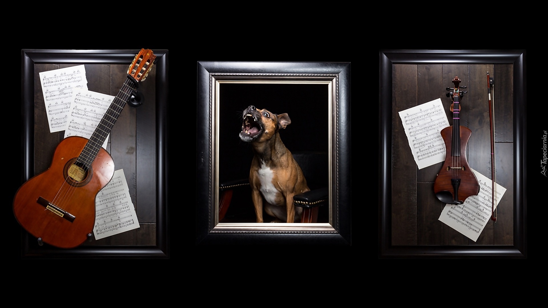Edytor tapety: Obrazy z gitarą skrzypcami i psem