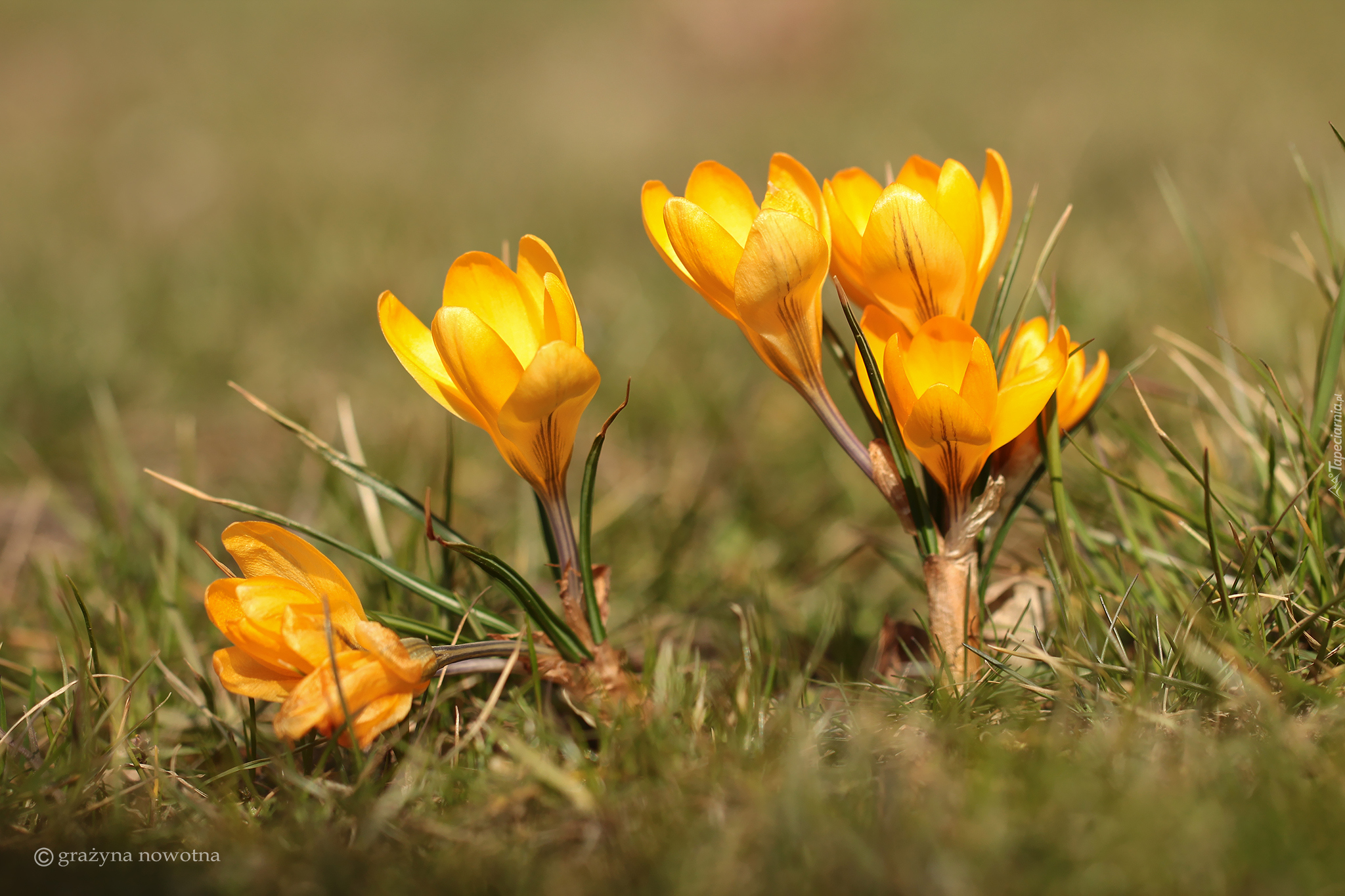 Edytor tapety: Dwie kępki krokusów w trawie