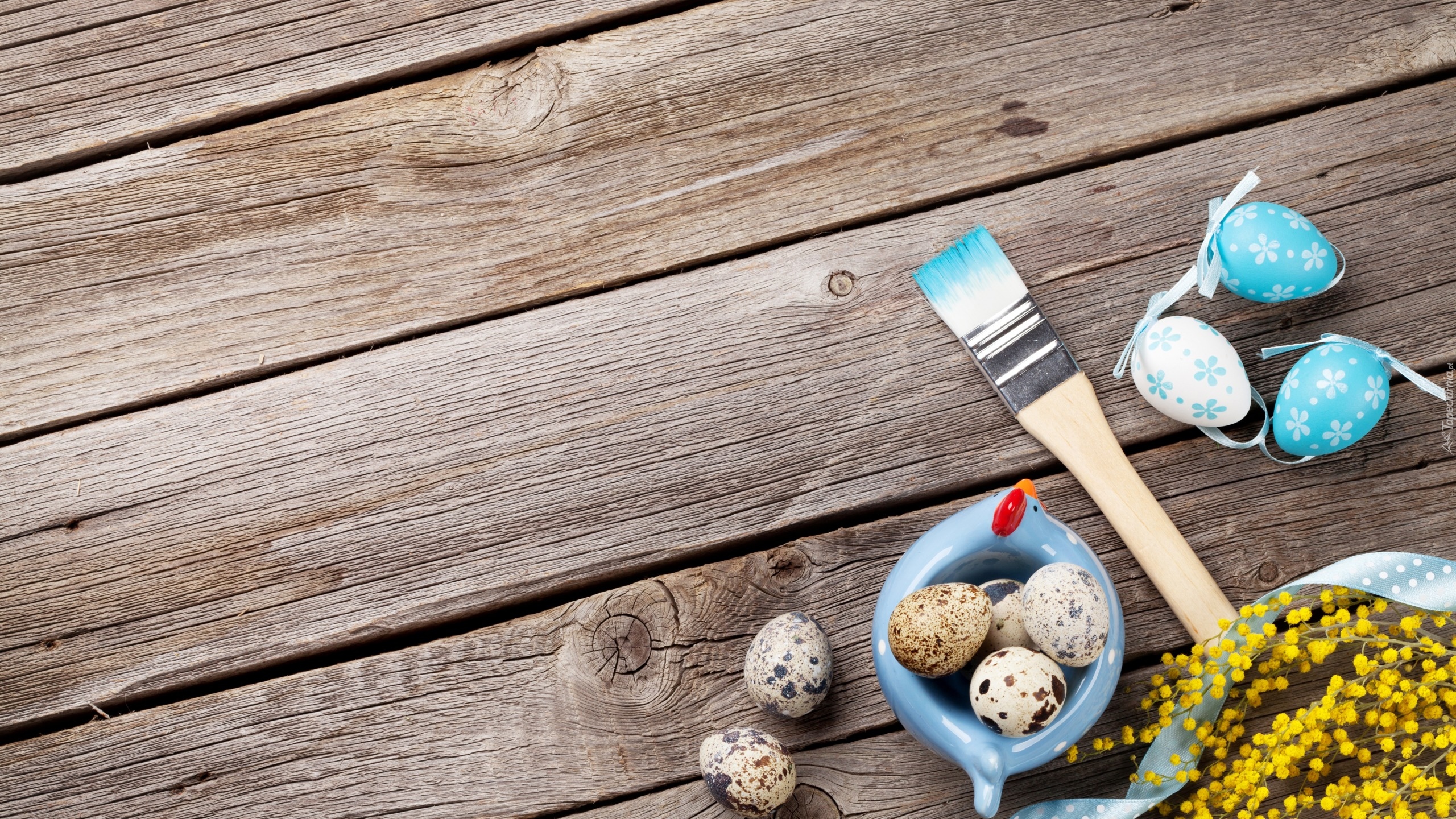 Edytor tapety: Jajeczka w miseczce obok pędzelka i żółtych kwiatków