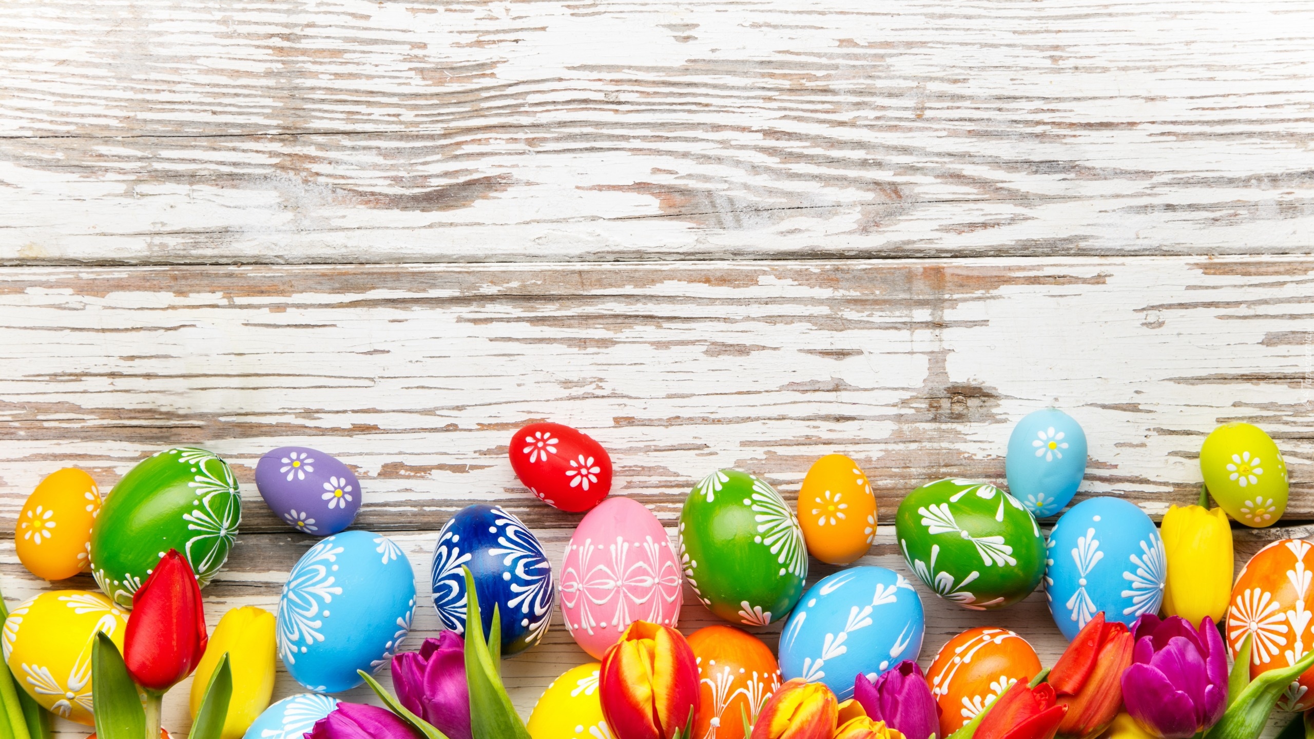 Edytor tapety: Wzorzyste pisanki z tulipanami na deskach