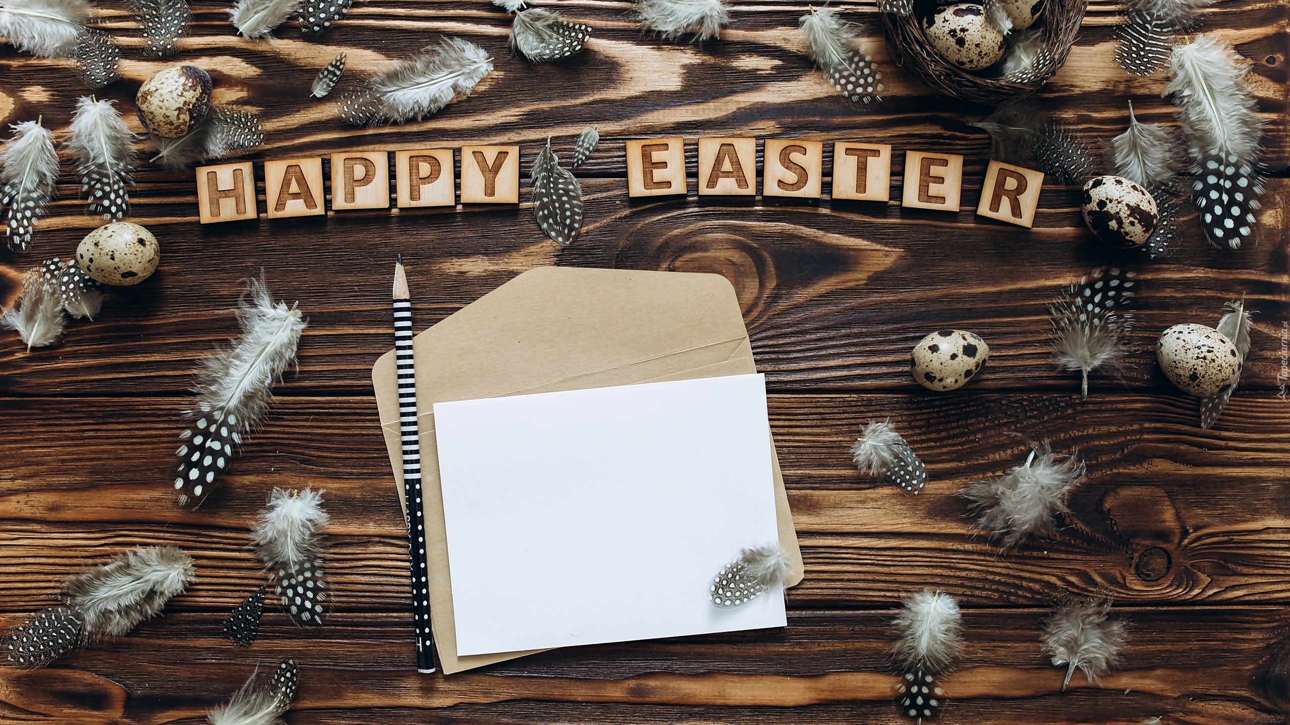 Edytor tapety: Jajeczka z piórkami koło koperty z napisem światecznym