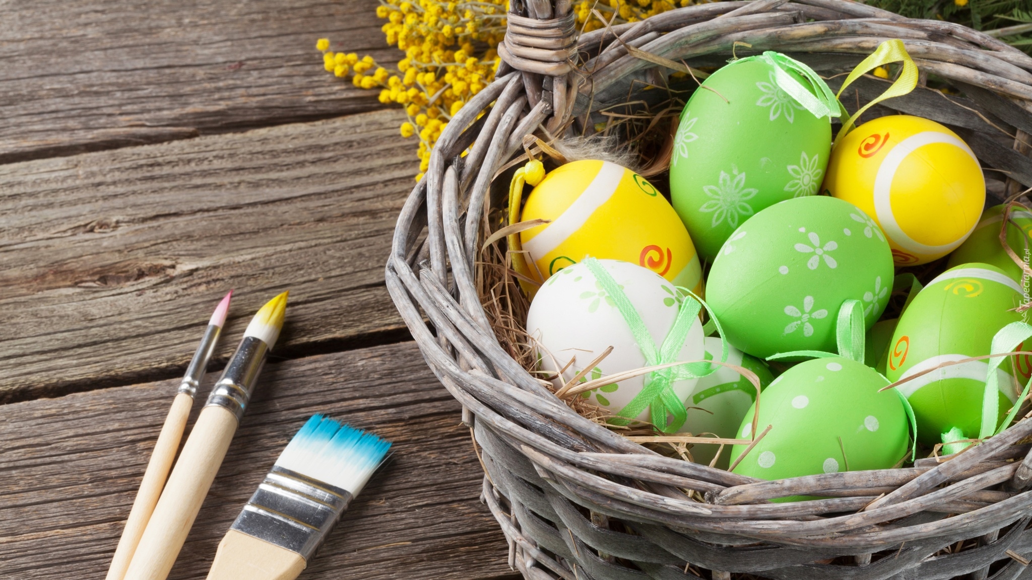 Edytor tapety: Pisanki w koszu z pędzlami