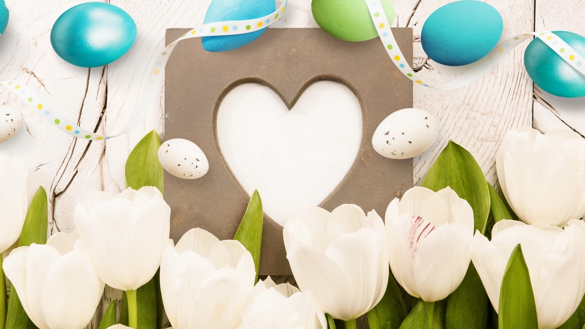 Edytor tapety: Serce z tekturki pośród pisanek i białych tulipanów
