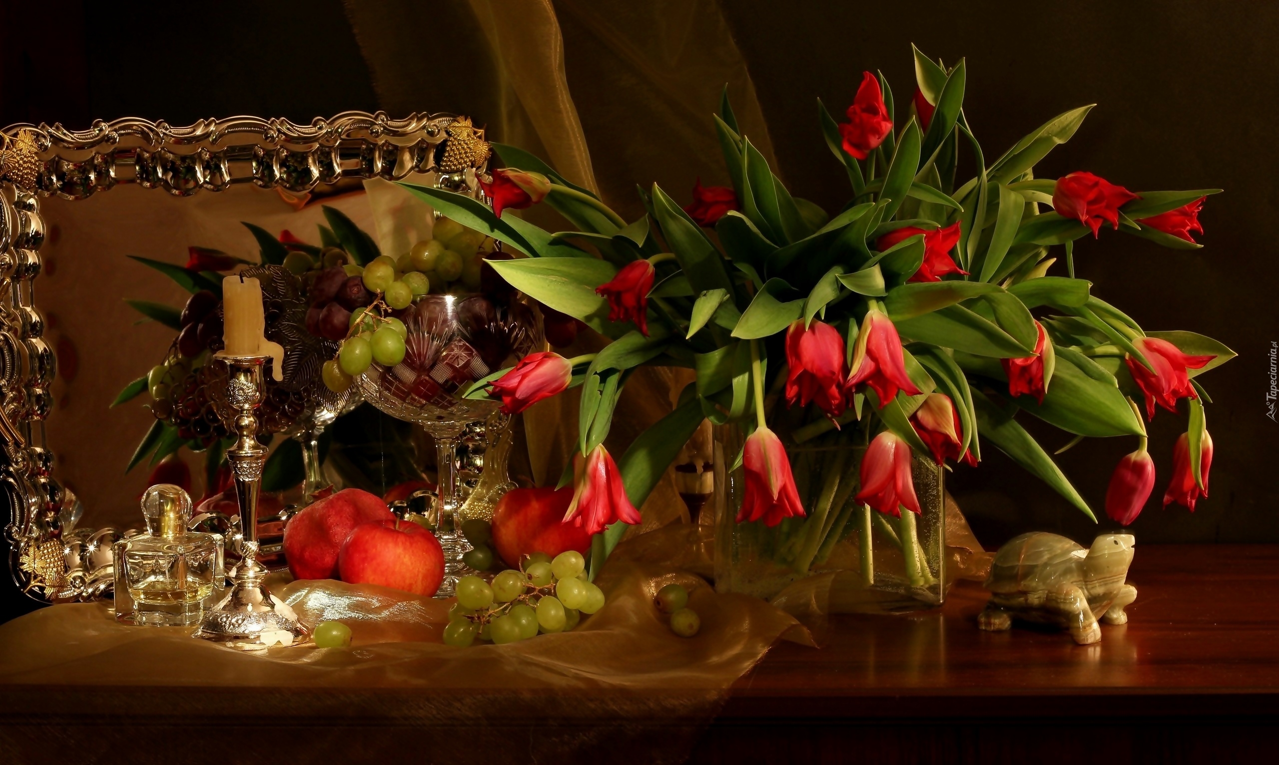 Edytor tapety: Tulipany we flakonie koło jabłek i winogrona