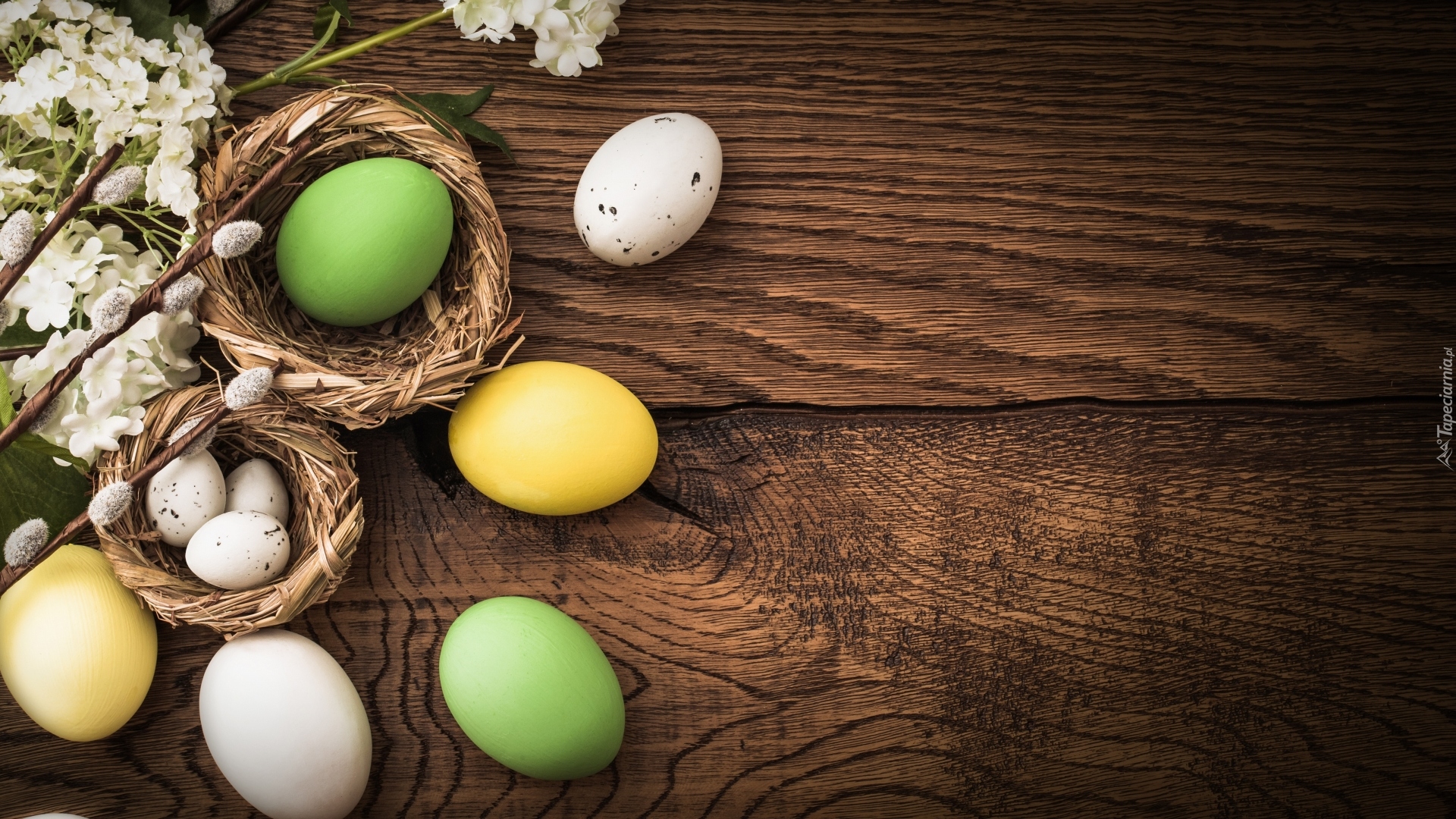Edytor tapety: Pisanki w gniazdach z kwiatkami