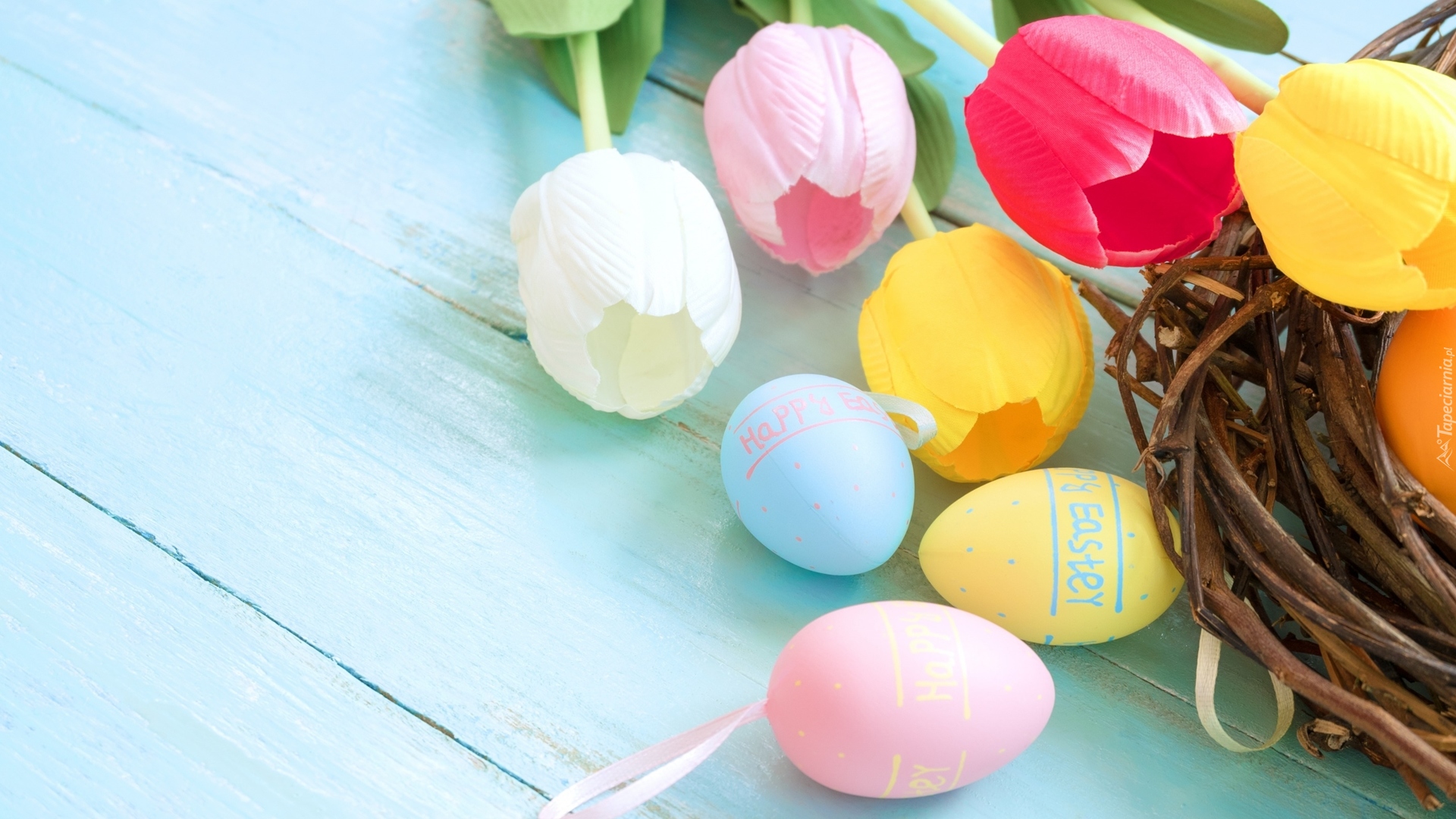 Edytor tapety: Pisanki z życzeniami koło tulipanów
